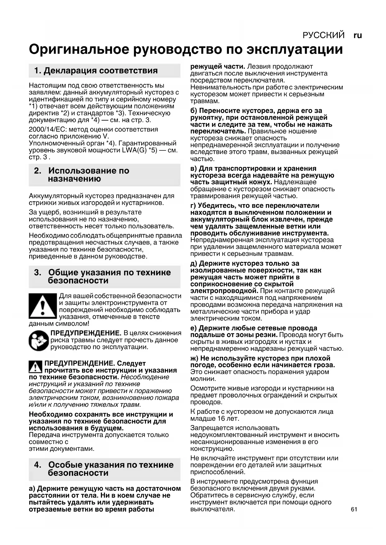 Оригинальное руководство по эксплуатации Настоящим под свою ответственность мы заявляем: данный аккумуляторный кусторез с идентификацией по типу и серийному номеру *1) отвечает всем действующим положениям директив *2) и стандартов *3). Техническую документацию для *4) — см. на стр.3. 2000/14/EС: метод оценки соответствия согласно приложению V. Уполномоченный орган *4). Гарантированный уровень звуковой мощности LWA(G) *5) — см. стр.3. Аккумуляторный кусторез предназначен для стрижки живых изгородей и кустарников. За ущерб, возникший в результате использования не по назначению, ответственность несет только пользователь. Необходимо соблюдать общепринятые правила предотвращения несчастных случаев, а также указания по технике безопасности, приведенные в данном руководстве. Для вашей собственной безопасности и защиты электроинструмента от повреждений необходимо соблюдать указания, отмеченные в тексте данным символом! ПРЕДУПРЕЖДЕНИЕ. В целях снижения риска травмы следует прочесть данное руководство по эксплуатации. ПРЕДУПРЕЖДЕНИЕ. Следует прочитать все инструкции и указания по технике безопасности. Несоблюдение инструкций и указаний по технике безопасности может привести к поражению электрическим током, возникновению пожара и/или к получению тяжелых травм. Необходимо сохранять все инструкции и указания по технике безопасности для использования в будущем. Передача инструмента допускается только совместно с этими документами. а) Держите режущую часть на достаточном расстоянии от тела. Ни в коем случае не пытайтесь удалять или удерживать отрезаемые ветки во время работы режущей части. Лезвия продолжают двигаться после выключения инструмента посредством переключателя. Невнимательность при работе с электрическим кусторезом может привести к серьезным