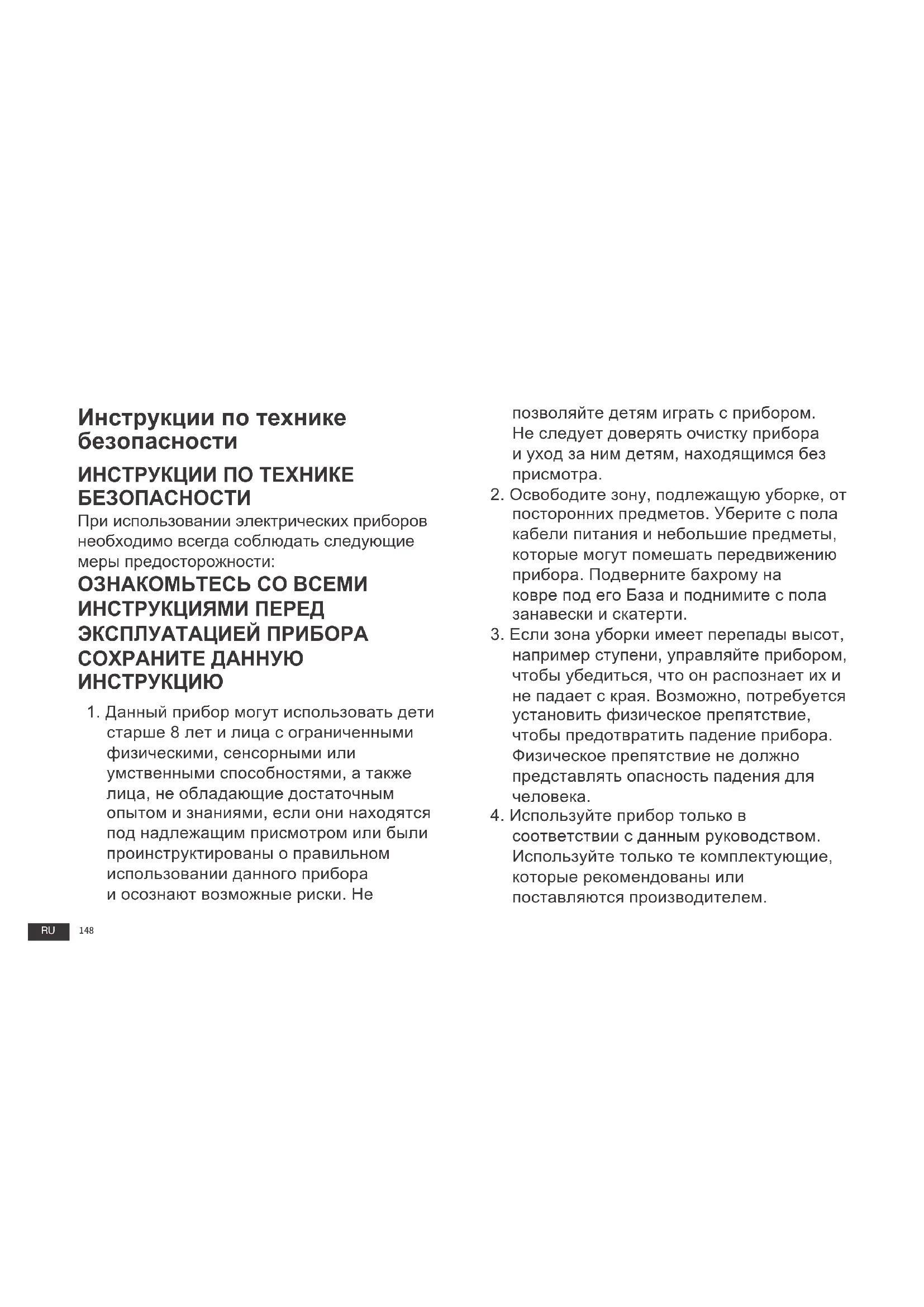 старше 8 лет и лица с ограниченными физическими, сенсорными или умственными способностями, а также лица, не обладающие достаточным опытом и знаниями, если они находятся под надлежащим присмотром или были проинструктированы о правильном использовании данного прибора и осознают возможные риски. Не позволяйте детям играть с прибором. Не следует доверять очистку прибора и уход за ним детям, находящимся без