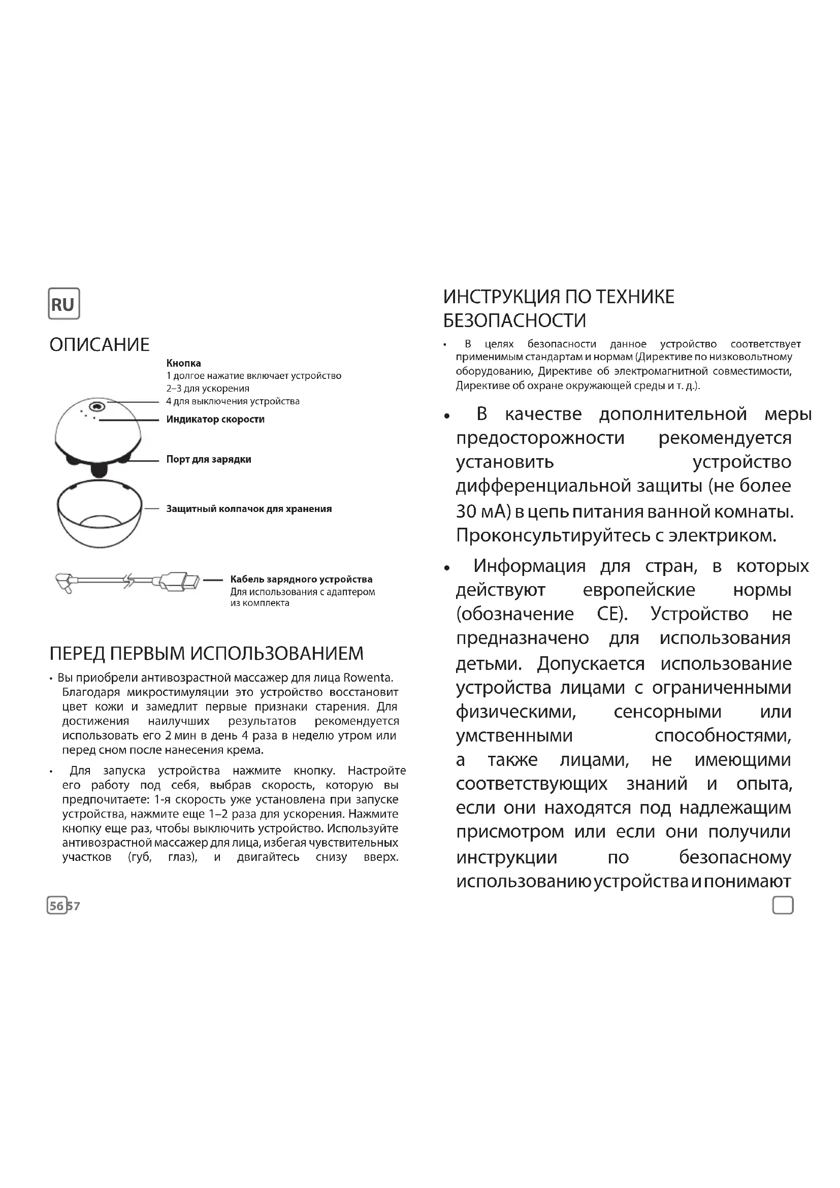 - Для запуска устройства нажмите кнопку. Настройте его работу под себя, выбрав скорость, которую вы предпочитаете: 1-я скорость уже установлена при запуске устройства, нажмите еще 1–2 раза для ускорения. Нажмите кнопку еще раз, чтобы выключить устройство. Используйте антивозрастной массажер для лица, избегая чувствительных участков (губ, глаз), и двигайтесь снизу вверх. Кнопка1 долгое нажатие включает устройство2–3 для ускорения4 для выключения устройстваИндикатор скоростиПорт для зарядкиЗащитный колпачок для храненияКабель зарядного устройстваДля использования с адаптером из комплекта ИНСТРУКЦИЯ ПО ТЕХНИКЕ БЕЗОПАСНОСТИ