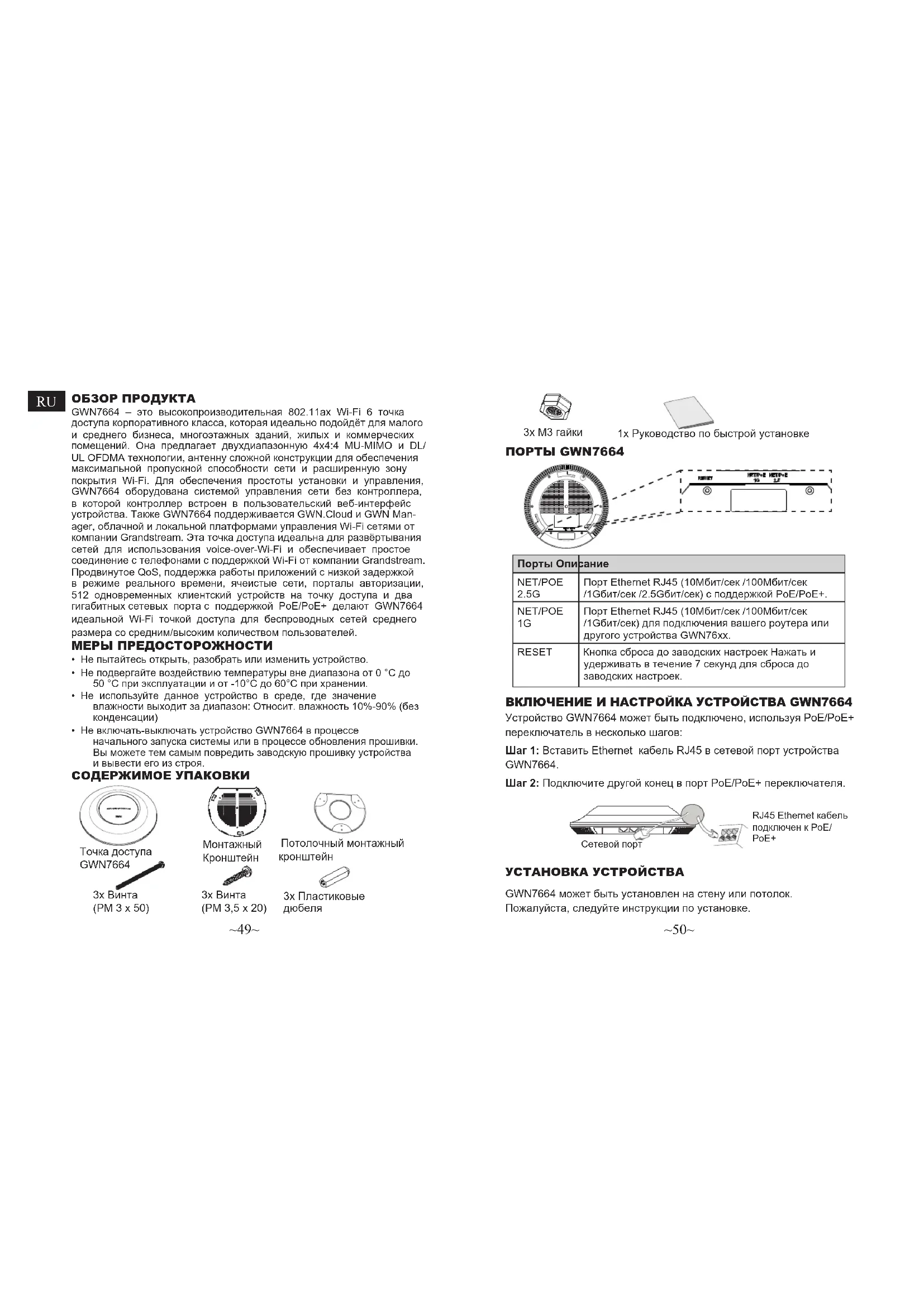 - Para gerenciar o GWN7664 a partir da plataforma na nuvem, por favor consulte o link https://www.gwn.cloud Os termos de licença GNU GPL estão dentro do rmware do dispositivo e você pode visualizar o documento através da interface web do disposi- tivo, em my_device_ip/gpl_license. Também, pode visualizar o documento através do site: http://www.grandstream.com/legal/open-source-software Para obter um CD com a informação do código fonte GPL, por favor solic- ite-o através de info@grandstream.com This device complies with part 15 of the FCC rules. Operation is subject to the following two conditions: (1) this device may not cause harmful interference, and (2) this device must accept any interference received, including interference that may cause undesired operation. CAN ICES-3(B)/NMB-3(B)IC: 11964A-GWN7664FCC ID: YZZGWN7664 Model: GWN7664 Input: 48V 0.5A PoE~49~ ~50~ ОБЗОР ПРОДУКТА GWN7664 – это высокопроизводительная 802.11ax Wi-Fi 6 точка доступа корпоративного класса, которая идеально подойдёт для малого и среднего бизнеса, многоэтажных зданий, жилых и коммерческих помещений. Она предлагает двухдиапазонную 4x4:4 MU-MIMO и DL/ UL OFDMA технологии, антенну сложной конструкции для обеспечения максимальной пропускной способности сети и расширенную зону покрытия Wi-Fi. Для обеспечения простоты установки и управления, GWN7664 оборудована системой управления сети без контроллера, в которой контроллер встроен в пользовательский веб-интерфейс устройства. Также GWN7664 поддерживается GWN.Cloud и GWN Man- ager, облачной и локальной платформами управления Wi-Fi сетями от компании Grandstream. Эта точка доступа идеальна для развёртывания сетей для использования voice-over-Wi-Fi и обеспечивает простое соединение с телефонами с поддержкой Wi-Fi от компании Grandstream. Продвинутое QoS, поддержка работы приложений с низкой задержкой в режиме реального времени, ячеистые сети, порталы авторизации, 512 одновременных клиентский устройств на точку доступа и два гигабитных сетевых порта с поддержкой PoE/PoE+ делают GWN7664 идеальной Wi-Fi точкой доступа для беспроводных сетей среднего размера со средним/высоким количеством пользователей. СОДЕРЖИМОЕ УПАКОВКИ МЕРЫ ПРЕДОСТОРОЖНОСТИ