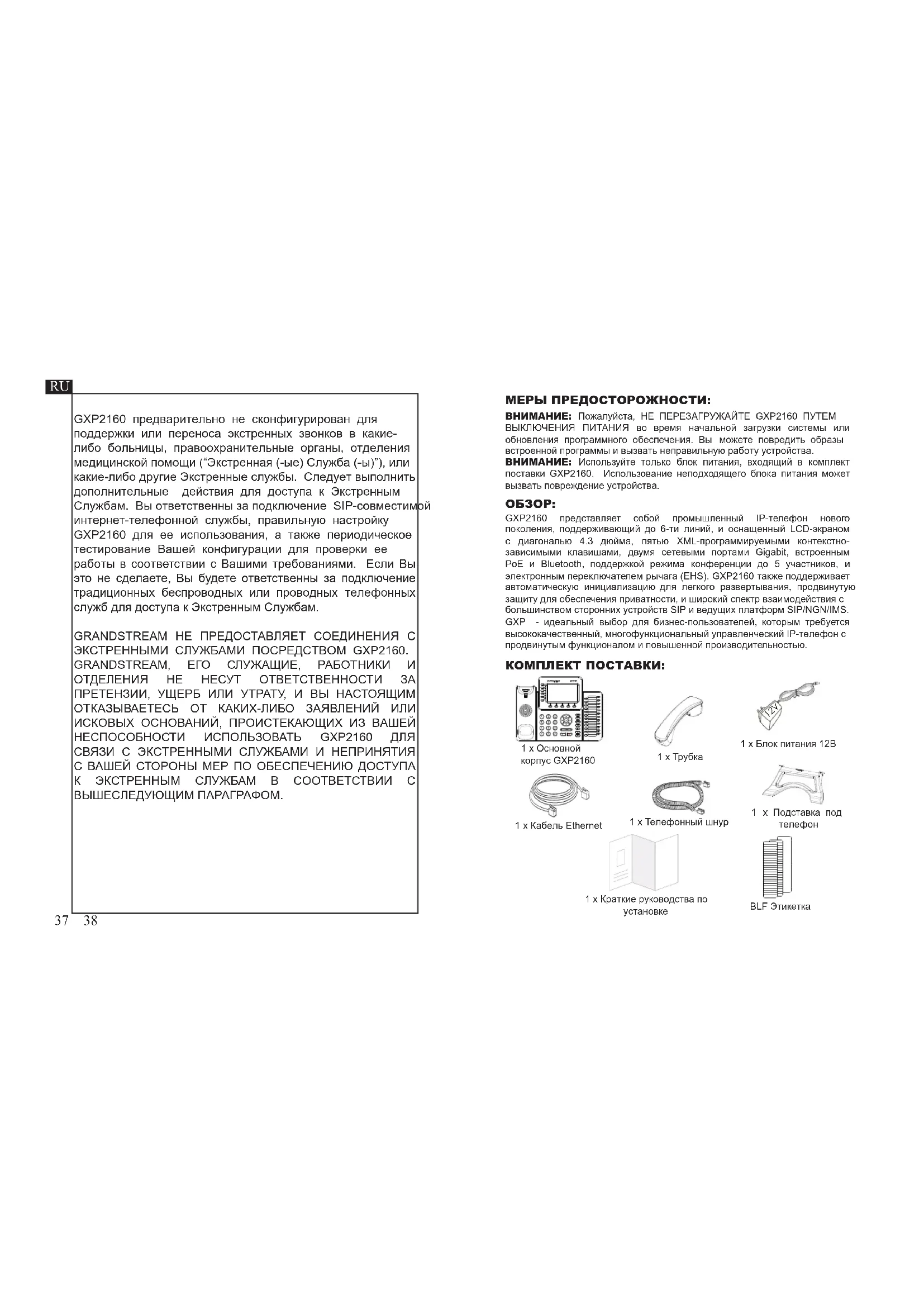 numerico, è possibile inoltre congurare il telefono usando o un IP statico o un DHCP.37 38 GXP2160 предварительно не сконфигурирован для поддержки или переноса экстренных звонков в какие- либо больницы, правоохранительные органы, отделения медицинской помощи (“Экстренная (-ые) Служба (-ы)”), или какие-либо другие Экстренные службы. Следует выполнить дополнительные действия для доступа к Экстренным Службам. Вы ответственны за подключение SIP-совместимой интернет-телефонной службы, правильную настройку GXP2160 для ее использования, а также периодическое тестирование Вашей конфигурации для проверки ее работы в соответствии с Вашими требованиями. Если Вы это не сделаете, Вы будете ответственны за подключение традиционных беспроводных или проводных телефонных служб для доступа к Экстренным Службам. GRANDSTREAM НЕ ПРЕДОСТАВЛЯЕТ СОЕДИНЕНИЯ С ЭКСТРЕННЫМИ СЛУЖБАМИ ПОСРЕДСТВОМ GXP2160. GRANDSTREAM, ЕГО СЛУЖАЩИЕ, РАБОТНИКИ И ОТДЕЛЕНИЯ НЕ НЕСУТ ОТВЕТСТВЕННОСТИ ЗА ПРЕТЕНЗИИ, УЩЕРБ ИЛИ УТРАТУ, И ВЫ НАСТОЯЩИМ ОТКАЗЫВАЕТЕСЬ ОТ КАКИХ-ЛИБО ЗАЯВЛЕНИЙ ИЛИ ИСКОВЫХ ОСНОВАНИЙ, ПРОИСТЕКАЮЩИХ ИЗ ВАШЕЙ НЕСПОСОБНОСТИ ИСПОЛЬЗОВАТЬ GXP2160 ДЛЯ СВЯЗИ С ЭКСТРЕННЫМИ СЛУЖБАМИ И НЕПРИНЯТИЯ С ВАШЕЙ СТОРОНЫ МЕР ПО ОБЕСПЕЧЕНИЮ ДОСТУПА К ЭКСТРЕННЫМ СЛУЖБАМ В СООТВЕТСТВИИ С ВЫШЕСЛЕДУЮЩИМ ПАРАГРАФОМ. КОМПЛЕКТ ПОСТАВКИ: