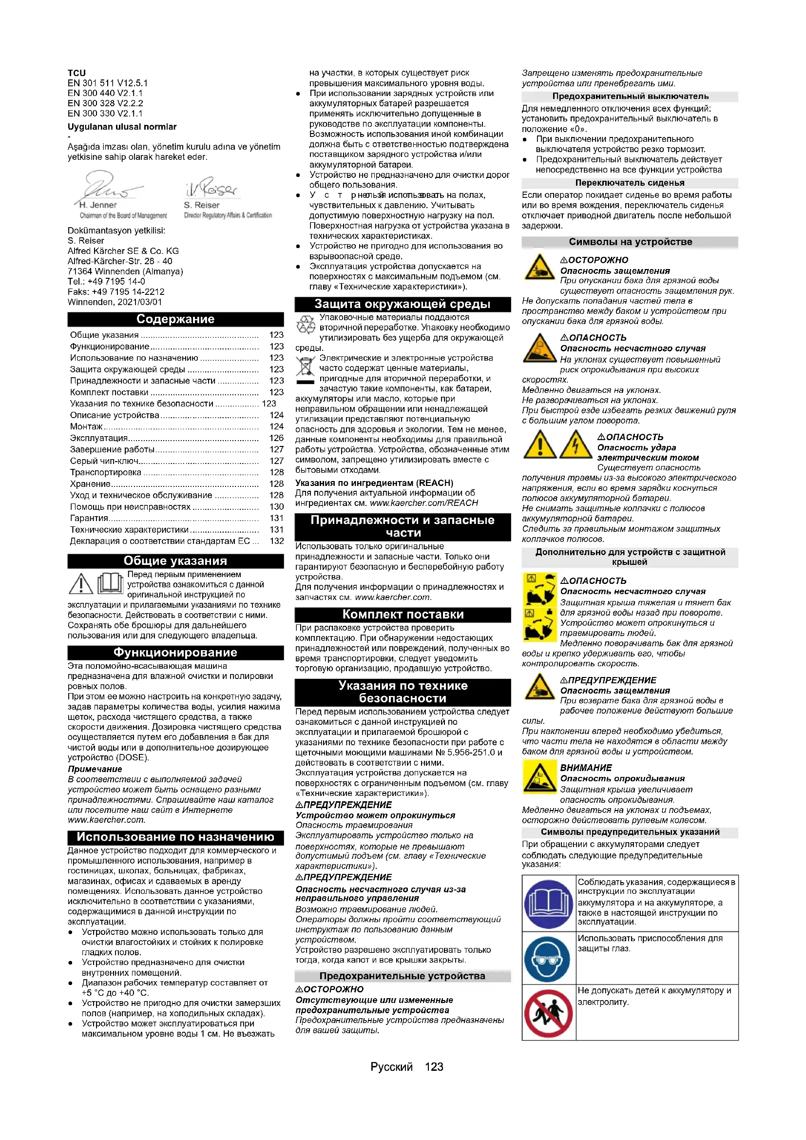 внутренних помещений. ●Диапазон рабочих температур составляет от +5 °C до +40 °C. ● Устройство не пригодно для очистки замерзших полов (например, на холодильных складах). ● Устройство может эксплуатироваться при максимальном уровне воды 1 см. Не въезжать на участки, в которых существует риск превышения максимального уровня воды. ●При использовании зарядных устройств или аккумуляторных батарей разрешается применять исключительно допущенные в руководстве по эксплуатации компоненты. Возможность использования иной комбинации должна быть с ответственностью подтверждена поставщиком зарядного устройства и/или аккумуляторной батареи. ●Устройство не предназначено для очистки дорог общего пользования. ●Устройство нельзя использовать на полах, чувствительных к давлению. Учитывать допустимую поверхностную нагрузку на пол. Поверхностная нагрузка от устройства указана в технических характеристиках. ●Устройство не пригодно для использования во взрывоопасной среде. ●Эксплуатация устройства допускается на поверхностях с максимальным подъемом (см. главу «Технические характеристики»). Защита окружающей среды Упаковочные материалы поддаются вторичной переработке. Упаковку необходимо утилизировать без ущерба для окружающей