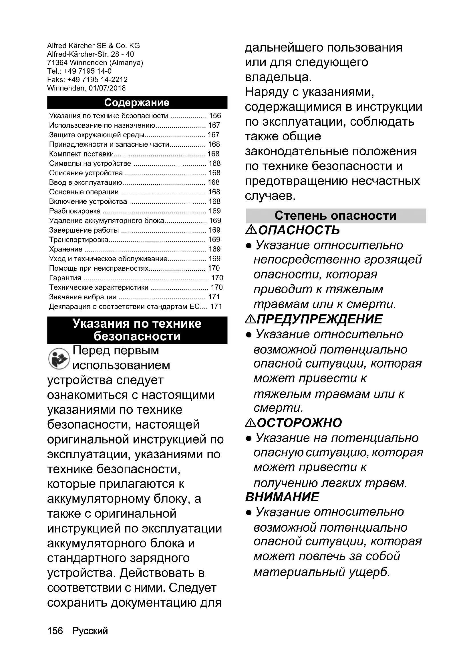 - относительно возможной потенциально опасной ситуации, которая может повлечь за собой материальный ущерб. Указания по технике безопасности p. 156