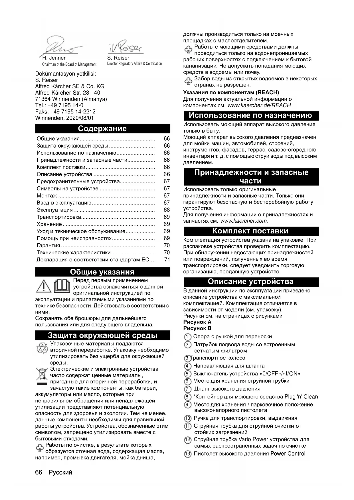 - Использовать только оригинальные принадлежности и запасные части. Только они гарантируют безопасную и бесперебойную работу устройства. Для получения информации о принадлежностях и запчастях см. www.kaercher.com. Комплект поставки Комплектация устройства указана на упаковке. При распаковке устройства проверить комплектацию. При обнаружении недостающих принадлежностей или повреждений, полученных во время транспортировки, следует уведомить торговую организацию, продавшую устройство. Описание устройства В данной инструкции по эксплуатации приведено описание устройства с максимальной комплектацией. Комплектация отличается в зависимости от модели (см. упаковку). Рисунки см. на страницах с рисунками Рисунок A Рисунок B 1 Опора с ручкой для переноски 2 Патрубок подвода воды со встроенным сетчатым фильтром 3 Транспортное колесо 4 Направляющая для шланга 5 Выключатель устройства «0/OFF»/«I/ON» 6 Место для хранения струйной трубки 7 Шланг высокого давления 8 *Контейнер для моющего средства Plug 'n' Clean 9 Место для хранения / парковочное положение высоконапорного пистолета 10 Ручка для транспортировки, выдвижная 11 Струйная трубка для струйной очистки от стойких загрязнений 12 Струйная трубка Vario Power устройства для самых распространенных задач по очистке 13 Пистолет высокого давления Power Control Общие указания p. 66