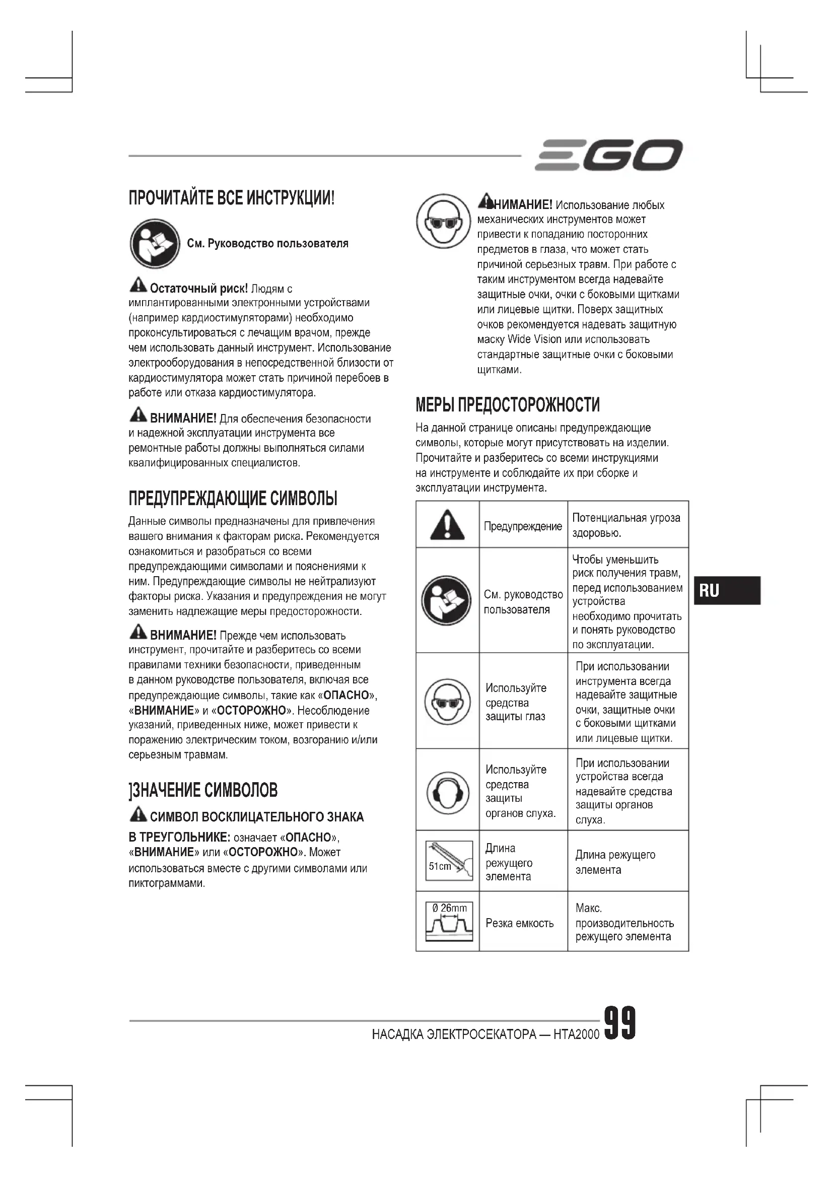 ДОПОЛНИТЕЛЬНЫЕ ПРЕДУПРЕЖДЕНИЯ ◾ Не заряжайте аккумулятор под дождем или во влажных условиях. ◾ Используйте только аккумуляторы и зарядные устройства EGO.АККУМУЛЯТОРНАЯ БАТАРЕЯЗАРЯДНОЕ УСТРОЙСТВОBA1120E, BA2240E, BA2800, BA3360, BA4200CH2100E CH5500E ◾ Прежде чем выбрасывать устройство, необходимо извлечь аккумулятор. ◾ Аккумулятор необходимо утилизировать безопасным способом. ◾ Не бросайте аккумуляторы в огонь. Аккумуляторы могут взорваться. Ознакомьтесь с местными нормами и правилами, которые могут содержать специальные инструкции по утилизации. ◾ Не вскрывайте и не деформируйте аккумулятор. Вытекший электролит может стать причиной коррозии и привести к повреждению глаз или кожи. Он токсичен при проглатывании. ВНИМАНИЕ! Электролит представляет собой разбавленную серную кислоту, которая опасна для кожи и глаз. Она электропроводна и агрессивна. ◾ Будьте осторожны при обращении с аккумуляторами, чтобы не замкнуть контакты предметами из проводящих материалов, такими как кольца, браслеты и ключи. Аккумулятор или контакт могут перегреться и вызвать ожоги. ◾ Работающие от аккумуляторов инструменты не требуется подключать к розетке электросети, поэтому они всегда готовы к использованию. Помните о возможности возникновения опасных ситуаций даже когда устройство не используется. Соблюдайте осторожность при выполнении технического обслуживания или ремонта. ◾ Извлеките аккумулятор перед выполнением обслуживания, очистки или удаления материала из высотореза. ◾ Запасные части. При ремонте используйте только идентичные запасные части EGO. Использование других принадлежностей или приспособлений может привести к получению травмы. ◾ Ремонт электроинструмента должен производиться квалифицированным специалистом с использованием только идентичных запасных частей. Это обеспечит безопасную работу электроинструмента. ◾ Не мойте устройство из шланга. Избегайте попадания воды в двигатель и электрические соединения. ◾ Храните устройство в сухом, высоком или закрытом месте, недоступном для детей. ◾ При возникновении ситуаций, не описанных в данном руководстве, соблюдайте осторожность и руководствуйтесь здравым смыслом. Обратитесь в сервисный центр EGO за помощью. ◾ Сохраните данные инструкции. Регулярно просматривайте их ипредоставляйте для ознакомления другим пользователям. Одалживая кому-либо устройство, передайте также данные инструкции для предотвращения неправильного использования и возможных травм. СОХРАНИТЕ ДАННЫЕ ИНСТРУКЦИИ ПРИМЕЧАНИЕ. ДОПОЛНИТЕЛЬНЫЕ СПЕЦИАЛЬНЫЕ ПРАВИЛА ТЕХНИКИ БЕЗОПАСНОСТИ СМ. В РУКОВОДСТВЕ ПОЛЬЗОВАТЕЛЯ ПРИВОДНОГО БЛОКА. ТЕХНИЧЕСКИЕ ХАРАКТЕРИСТИКИ Длина режущего элемента 51 cmПроизводительность резания 26 mmМасса (без батарейного блока) 2,28 кгИзмеренный уровень звуковой мощности L