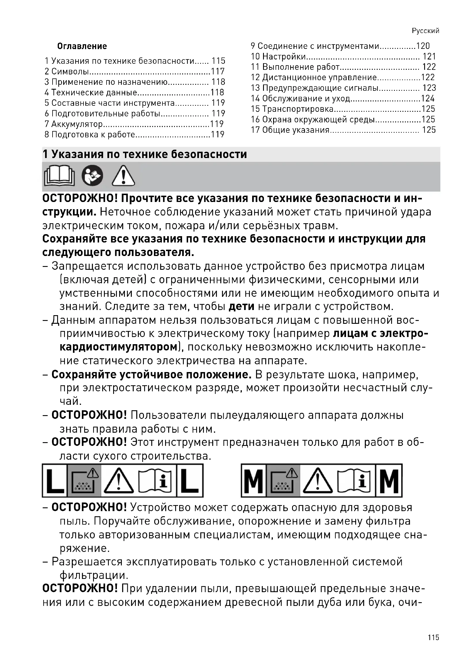 – ОСТОРОЖНО! Пользователи пылеудаляющего аппарата должны знать правила работы с ним. – ОСТОРОЖНО! Этот инструмент предназначен только для работ в об ласти сухого строительства. – ОСТОРОЖНО! Устройство может содержать опасную для здоровья пыль. Поручайте обслуживание, опорожнение и замену фильтра только авторизованным специалистам, имеющим подходящее сна