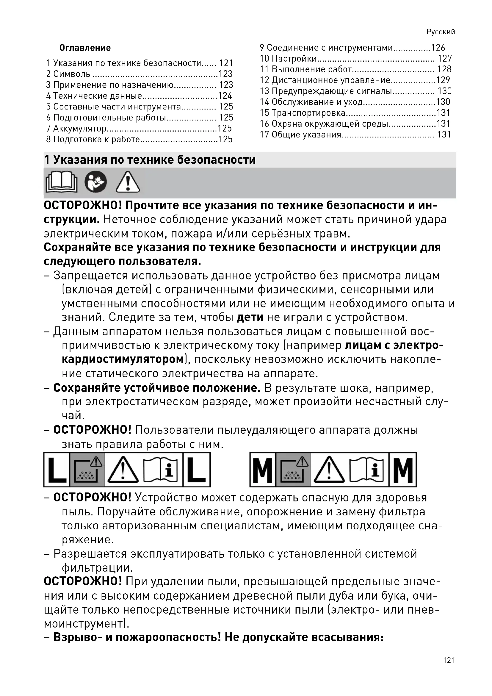 - 17 Общие указания 1 Указания по технике безопасности ОСТОРОЖНО! Прочтите все указания по технике безопасности и ин струкции. Неточное соблюдение указаний может стать причиной удара электрическим током, пожара и/или серьёзных травм. Сохраняйте все указания по технике безопасности и инструкции для следующего пользователя. – Запрещается использовать данное устройство без присмотра лицам (включая детей) с ограниченными физическими, сенсорными или умственными способностями или не имеющим необходимого опыта и знаний. Следите за тем, чтобы дети не играли с устройством. – Данным аппаратом нельзя пользоваться лицам с повышенной вос приимчивостью к электрическому току (например лицам с электро кардиостимулятором), поскольку невозможно исключить накопле ние статического электричества на аппарате. – Сохраняйте устойчивое положение. В результате шока, например, при электростатическом разряде, может произойти несчастный слу p. 131