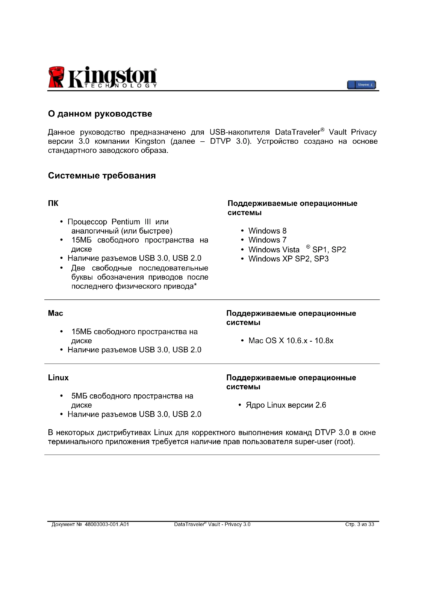 *Примечание: Для некоторых дистрибутивов Linux для корр ектного выполнения команд DTVP 3.0 в окне терминального приложения требуется наличие прав пользователя super-user (root). -Конец раздела Linux-Документ № 48003003-001.A01 DataTraveler