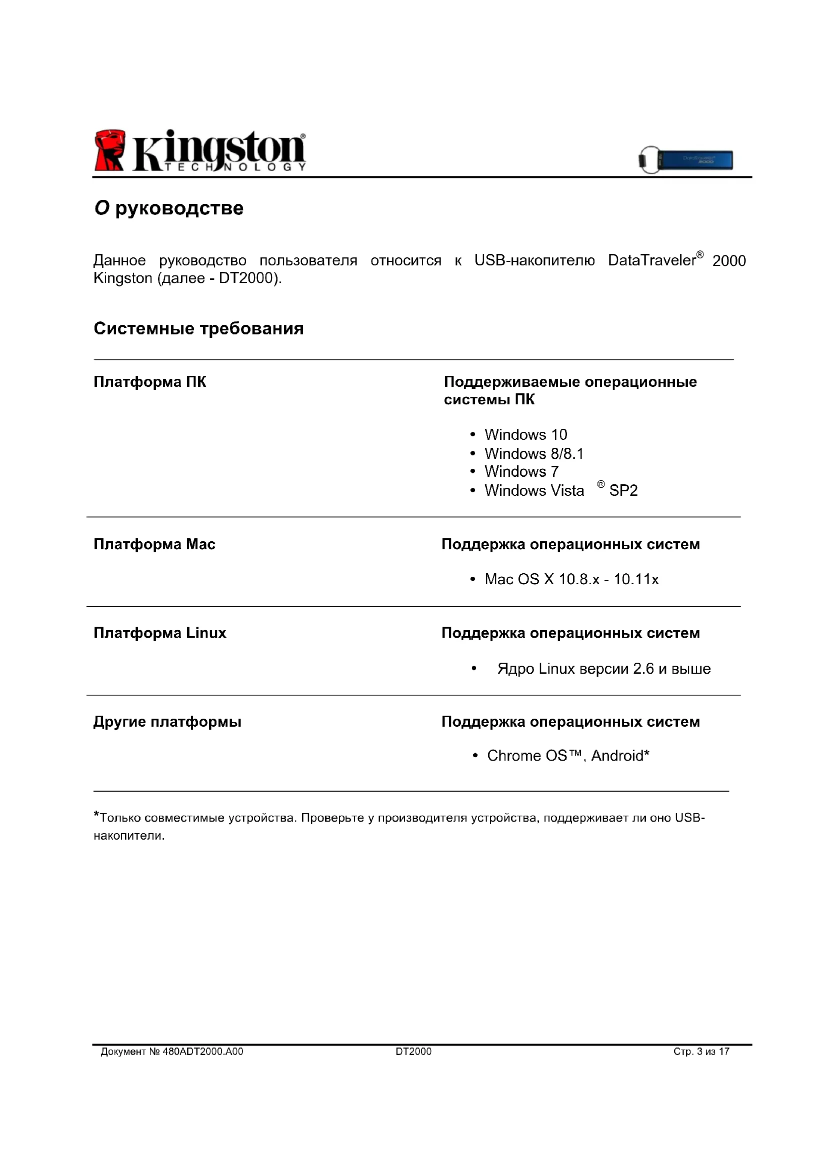2000 используется технология DataLock компании ClevX, LLC. ©2016 Kingston Technology Corporation, 17600 Newhope Street, Fountain Valley, CA 92708 USA. Все права защищены. Все то ва рные знаки и зарегистрированные товарные знаки являются собственностью соответствующих владельцев.Документ № 480ADT2000.A00 DT2000 Стр. 2 из 17