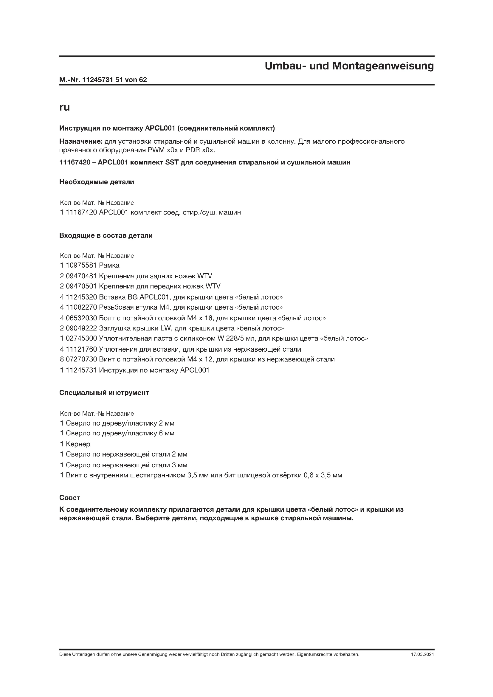 Инструкция по монтажу APCL001 (соединительный комплект) Назначение: для установки стиральной и сушильной машин в колонну. Для малого профессионального прачечного оборудования PWMx0x и PDRx0x. 11167420 – APCL001 комплект SST для соединения стиральной и сушильной машин Необходимые детали Кол-во Мат.-№ Название 1 11167420 APCL001 комплект соед. стир./суш. машин Входящие в состав детали Кол-во Мат.-№ Название 1 10975581 Рамка 2 09470481 Крепления для задних ножек WTV 2 09470501 Крепления для передних ножек WTV 4 11245320 Вставка BGAPCL001, для крышки цвета «белый лотос» 4 11082270 Резьбовая втулка M4, для крышки цвета «белый лотос» 4 06532030 Болт с потайной головкой M4х16, для крышки цвета «белый лотос» 2 09049222 Заглушка крышки LW, для крышки цвета «белый лотос» 1 02745300 Уплотнительная паста с силиконом W228/5мл, для крышки цвета «белый лотос» 4 11121760 Уплотнения для вставки, для крышки из нержавеющей стали 8 07270730 Винт с потайной головкой M4х12, для крышки из нержавеющей стали 1 11245731 Инструкция по монтажу APCL001 Специальный инструмент Кол-во Мат.-№ Название 1 Сверло по дереву/пластику 2мм 1 Сверло по дереву/пластику 6мм 1 Кернер 1 Сверло по нержавеющей стали 2мм 1 Сверло по нержавеющей стали 3мм 1 Винт с внутренним шестигранником 3,5мм или бит шлицевой отвёртки 0,6x3,5мм