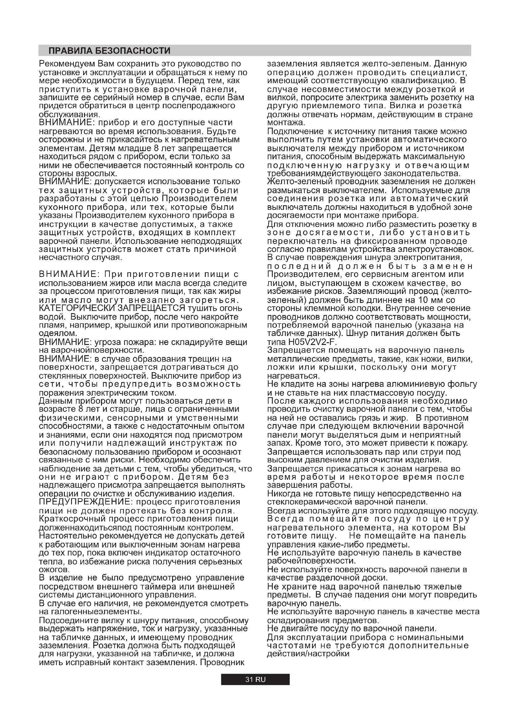 ПРЕДУПРЕЖДЕНИЕ: процесс приготовления пищи не должен протекать без контроля. Краткосрочный процесс приготовления пищи долженнаходитьсяпод постоянным контролем. Настоятельно рекомендуется не допускать детей к работающим или выключенным зонам нагрева до тех пор, пока включен индикатор остаточного тепла, во избежание риска получения серьезных
