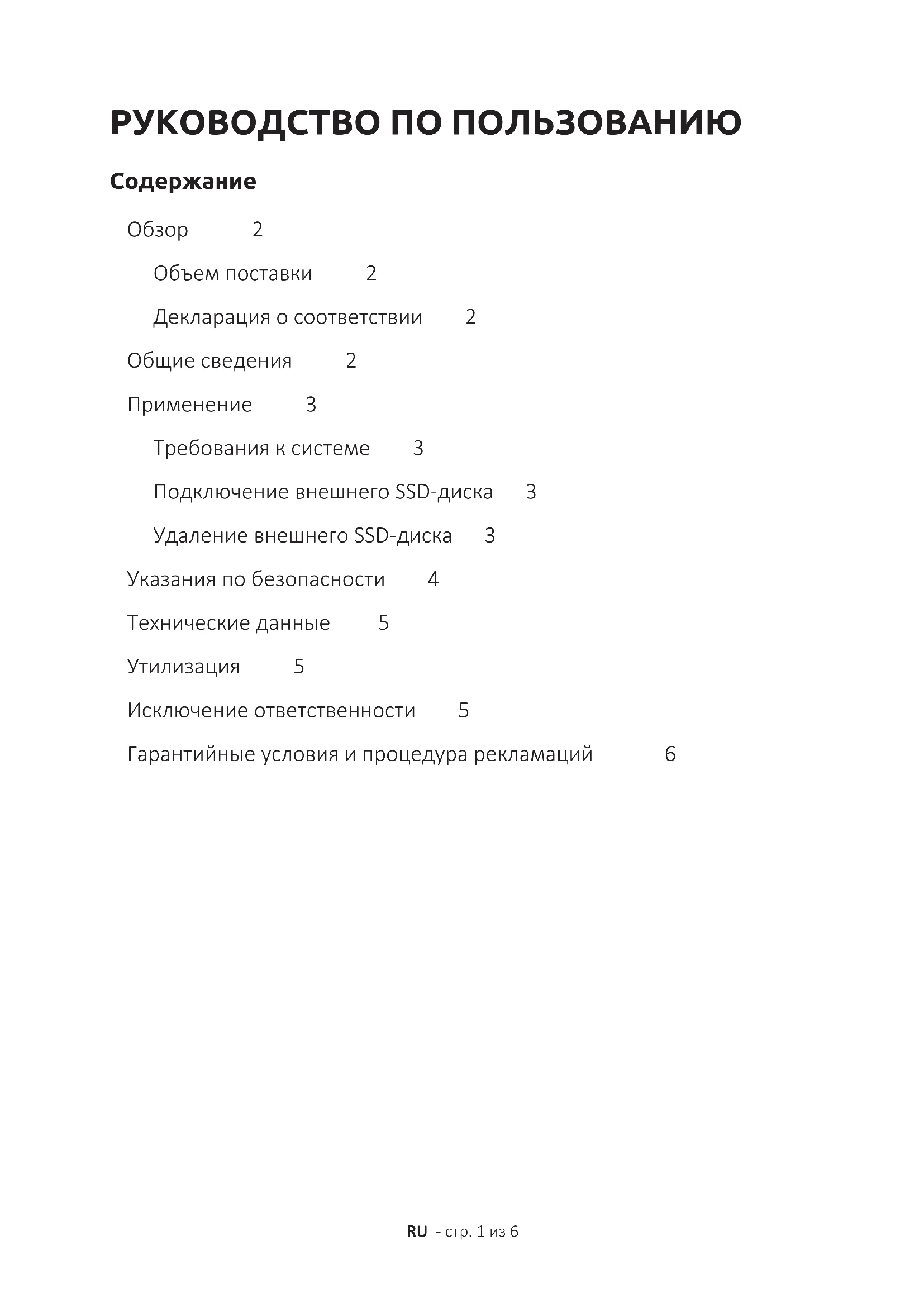 Oбзор 2 Объем поставки 2 Декларация о соответствии 2 Общие сведения 2 Применение 3 Требования к системе 3 Подключение внешнего SSD-диска 3 Удаление внешнего SSD-диска 3 Указания по безопасности 4 Технические данные 5 Утилизация 5 Исключение ответственности 5 Гарантийные условия и процедура рекламаций 6RU - стр. 2 из 6 Внимательно прочтите и соблюдайте это руководство. Выполняйте все содержащиеся в этом руководстве указания, чтобы обеспечить долгую и надежную работу устройства. Храните это руководство в легко доступном месте. При передаче устройства другим пользователям передайте вместе с ним и руководство. Об этом руководстве ОБЩИЕ СВЕДЕНИЯ Маркировка знаком „СЕ“ свидетельствует о том, что этот продукт отвечает требованиям всех действующих директив Европейского Союза, относящихся к этому продукту. Объем поставки