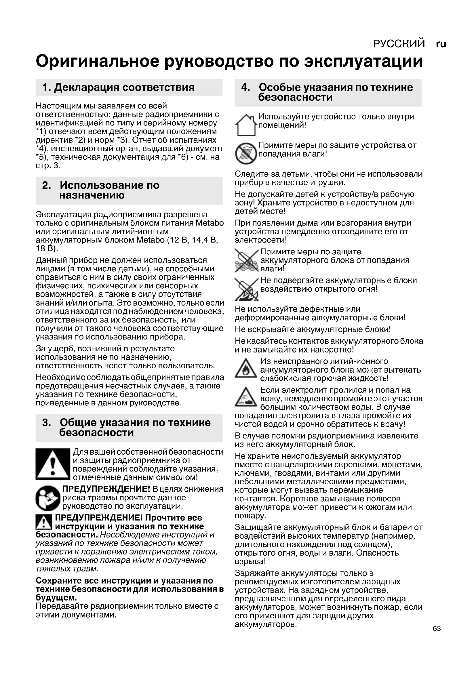 Оригинальное руководство по эксплуатации Настоящим мы заявляем со всей ответственностью: данные радиоприемники с идентификацией по типу и серийному номеру *1) отвечают всем действующим положениям директив *2) и норм *3). Отчет об испытаниях *4), инспекционный орган, выдавший документ *5), техническая документация для *6) - см. на стр. 3. Эксплуатация радиоприемника разрешена только с оригинальным блоком питания Metabo или оригинальным литий-ионным аккумуляторным блоком Metabo (12 В, 14,4 В, 18 В). Данный прибор не должен использоваться лицами (в том числе детьми), не способными справиться с ним в силу своих ограниченных физических, психических или сенсорных возможностей, а также в силу отсутствия знаний и/или опыта. Это возможно, только если эти лица находятся под наблюдением человека, ответственного за их безопасность,