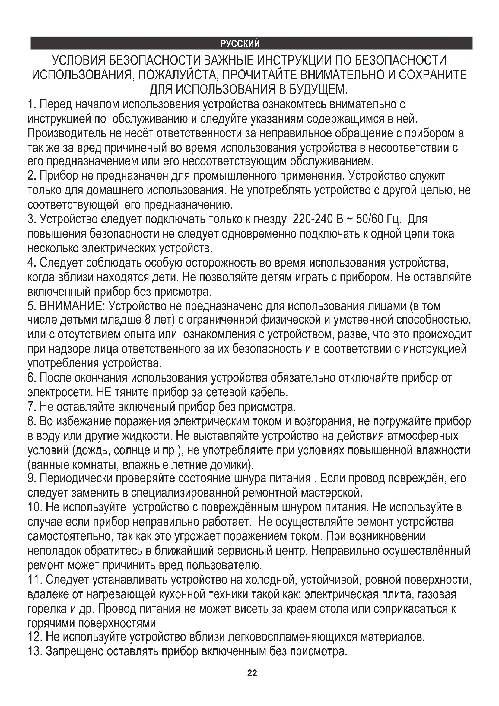 LE IMPORTANTI ISTRUZIONI CHE RIGUARDANO LA SICUREZZA D'USO VANNO LETTE CON ATTENZIONE E CONSERVATE PER FUTURE CONSULTAZIONI 1.Prima di procedere all'utilizzo dell'apparecchio è necessario leggere attentamente le sue istruzioni d'uso e seguire le indicazioni ivi contenute. Il fabbricante non è responsabile dei danni derivanti dall'uso improprio o scorretto del dispositivo. 2.L'apparecchio è destinato esclusivamente ad uso domestico. Non utilizzarlo per scopi diversi rispetto a quelli per cui è stato costruito. 3.L'apparecchio deve essere collegato esclusivamente alla presa con messa a terra 220- 240 V ~ 50/60 Hz. Al fine di garantire una maggiore sicurezza di utilizzo, allo stesso circuito elettrico non devono essere collegati contemporaneamente molti dispositivi elettrici. Заботясь об окружающей среде.. Упаковку из картона передайте,пожалуйста, на макулатуру. Полиэтиленовые мешки (РЕ) выкидать в резервуар для пластмассы. Изношенное устройство надо передать в соответствующую точку хранения, так как находящиесяв устройствеопасные составляющие могут являться угрозой для окружающей среды. Электрическое устройство надо передать таким образом, чтобы ограничить его повторное употребление и использование. Если в устройстве находятся батареи, их надо вытянуть и передать в точку хранения отдельно. Устройство не выкидать в резервуар для коммунальных отходов!