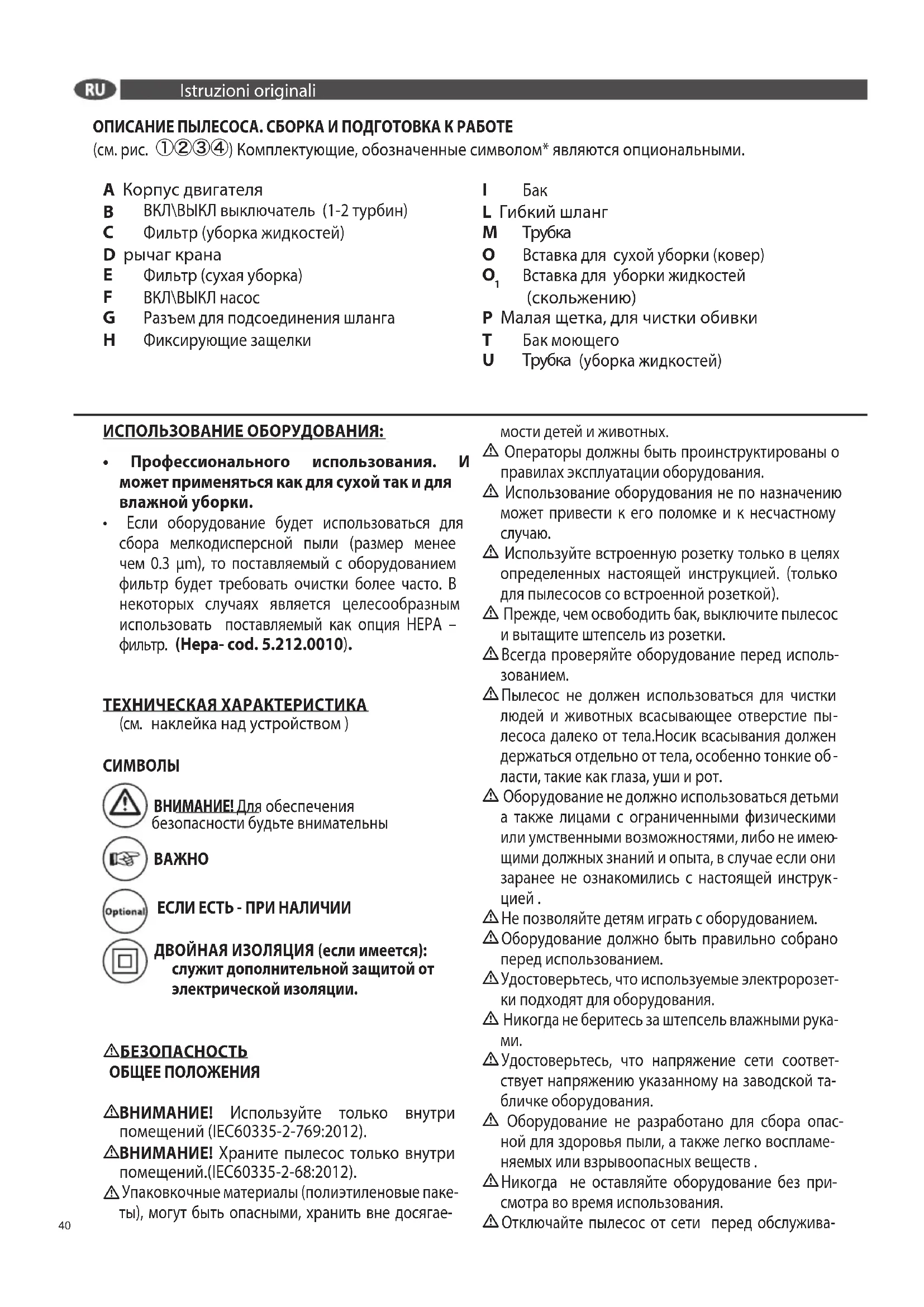 - Установите фильтр () в бак (I). - Поместите турбинный блок () на бак (I) и застегните замки (G) - Вставьте вакуумный шланг (L) в вакуумное отверстие (H) - Разместите удлинительные трубки () на конце гибкого шланга (L) и присоедините наиболее подходящие аксессуары. - Подсоедините пылесос к подходящей сетевой розетке. - Начните работать, нажав выключатель ().