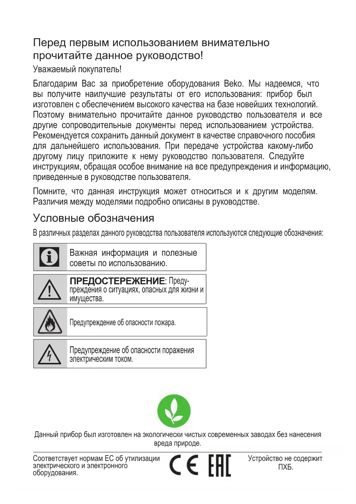 HCA63640B HCA63640BH HCA93640BH HCA93641BH HCA63640Z HCA63640W 01M-8802543200-3120-06 01M-8895513200-3120-06 01M-8802773200-3120-06 01M-8895393200-3120-06 01M-8808883200-3120-06 01M-8895413200-3120-06 01M-8861023200-3120-06 01M-8895343200-3120-06 01M-8861053200-3120-06 01M-8895383200-3120-06 01M-8861063200-3120-06 01M-8895503200-3120-06Перед первым использованием внимательно прочитайте данное руководство! Уважаемый покупатель! Благодарим Вас за приобретение оборудования Beko. Мы надеемся, что вы получите наилучшие результаты от его использования: прибор был изготовлен с обеспечением высокого качества на базе новейших технологий. Поэтому внимательно прочитайте данное руководство пользователя и все другие сопроводительные документы перед использованием устройства. Рекомендуется сохранить данный документ в качестве справочного пособия для дальнейшего использования. При передаче устройства какому-либо другому лицу приложите к нему руководство пользователя. Следуйте инструкциям, обращая особое внимание на все предупреждения и информацию, приведенные в руководстве пользователя. Помните, что данная инструкция может относиться и к другим моделям. Различия между моделями подробно описаны в руководстве. Условные обозначения В различных разделах данного руководства пользователя используются следующие обозначения: