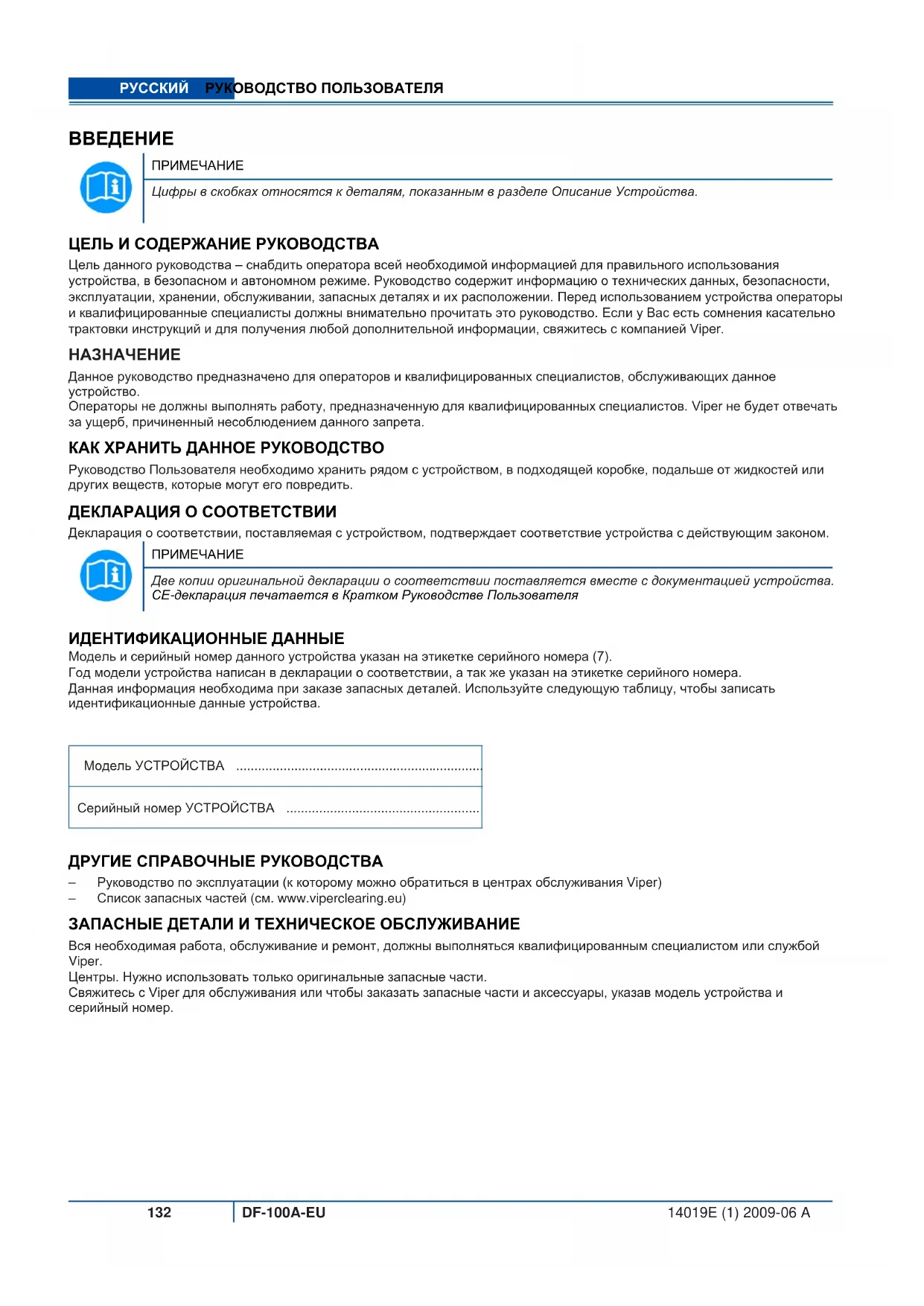 Данное руководство предназначено для операторов и квалифицированных специалистов, обслуживающих данное устройство. Операторы не должны выполнять работу, предназначенную для квалифицированных специалистов. Viper не будет отвечать за ущерб, причиненный несоблюдением данного запрета. КАК ХРАНИТЬ ДАННОЕ РУКОВОДСТВО Руководство Пользователя необходимо хранить рядом с устройством, в подходящей коробке, подальше от жидкостей или других веществ, которые могут его повредить. ДЕКЛАРАЦИЯ О СООТВЕТСТВИИ Декларация о соответствии, поставляемая с устройством, подтверждает соответствие устройства с действующим законом.