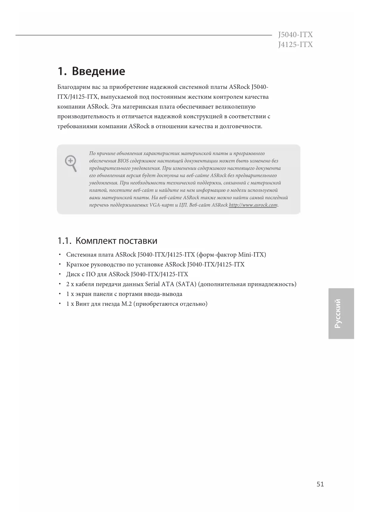 Благодарим вас за приобретение надежной системной платы ASRock J5040- ITX/J4125-ITX, выпускаемой под постоянным жестким контролем качества компании ASRock. Эта материнская плата обеспечивает великолепную производительность и отличается надежной конструкцией в соответствии с требованиями компании ASRock в отношении качества и долговечности. 1.1. Комплект поставки