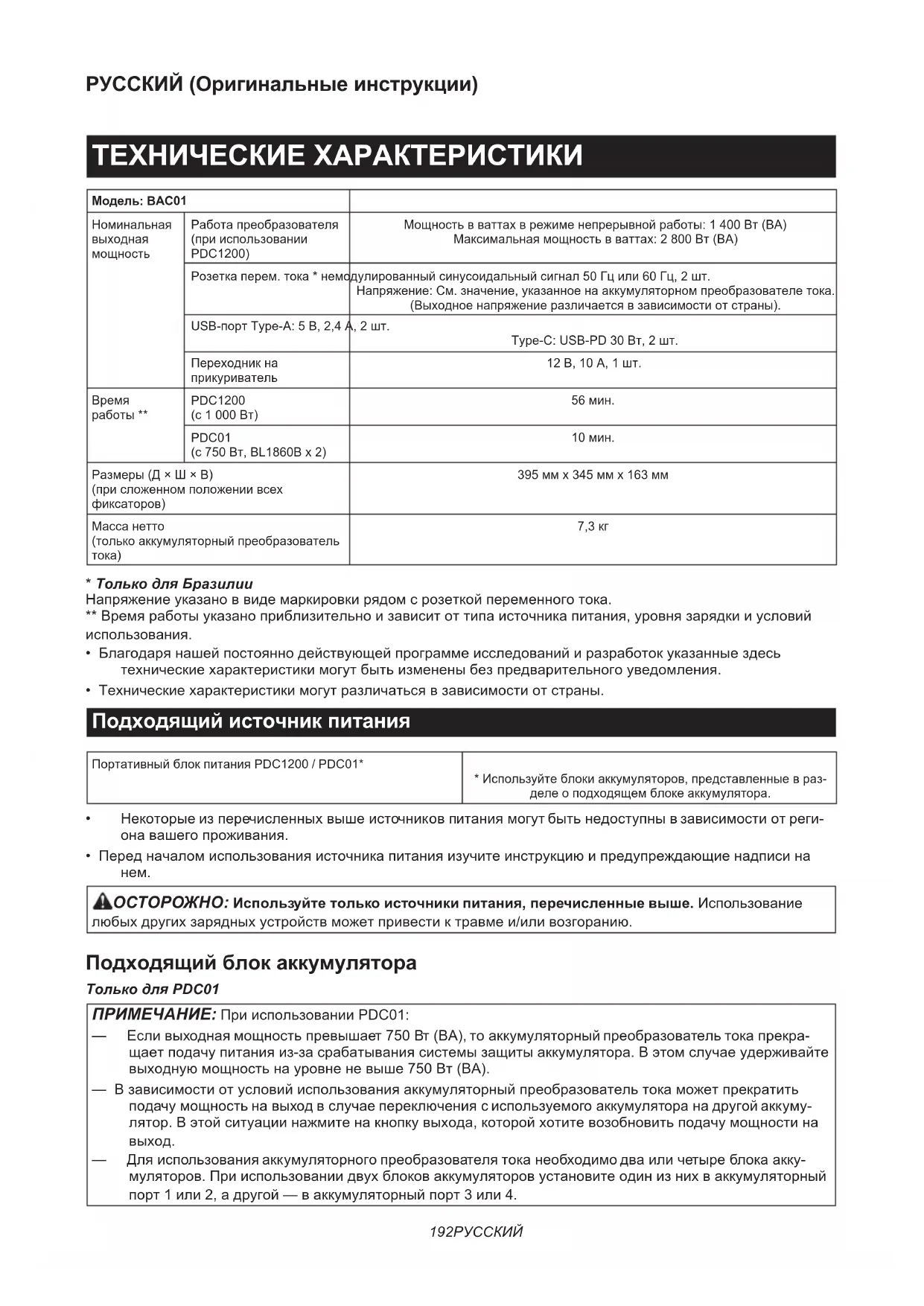 ОСТОРОЖНО: Используйте только источники питания, перечисленные выше. Использование любых других зарядных устройств может привести к травме и/или возгоранию. Подходящий блок аккумулятора Только для PDC01 ПРИМЕЧАНИЕ: При использовании PDC01: — Если выходная мощность превышает 750 Вт (ВА), то аккумуляторный преобразователь тока прекра- щает подачу питания из-за срабатывания системы защиты аккумулятора. В этом случае удерживайте выходную мощность на уровне не выше 750 Вт (ВА). — В зависимости от условий использования аккумуляторный преобразователь тока может прекратить подачу мощность на выход в случае переключения с используемого аккумулятора на другой аккуму- лятор. В этой ситуации нажмите на кнопку выхода, которой хотите возобновить подачу мощности на