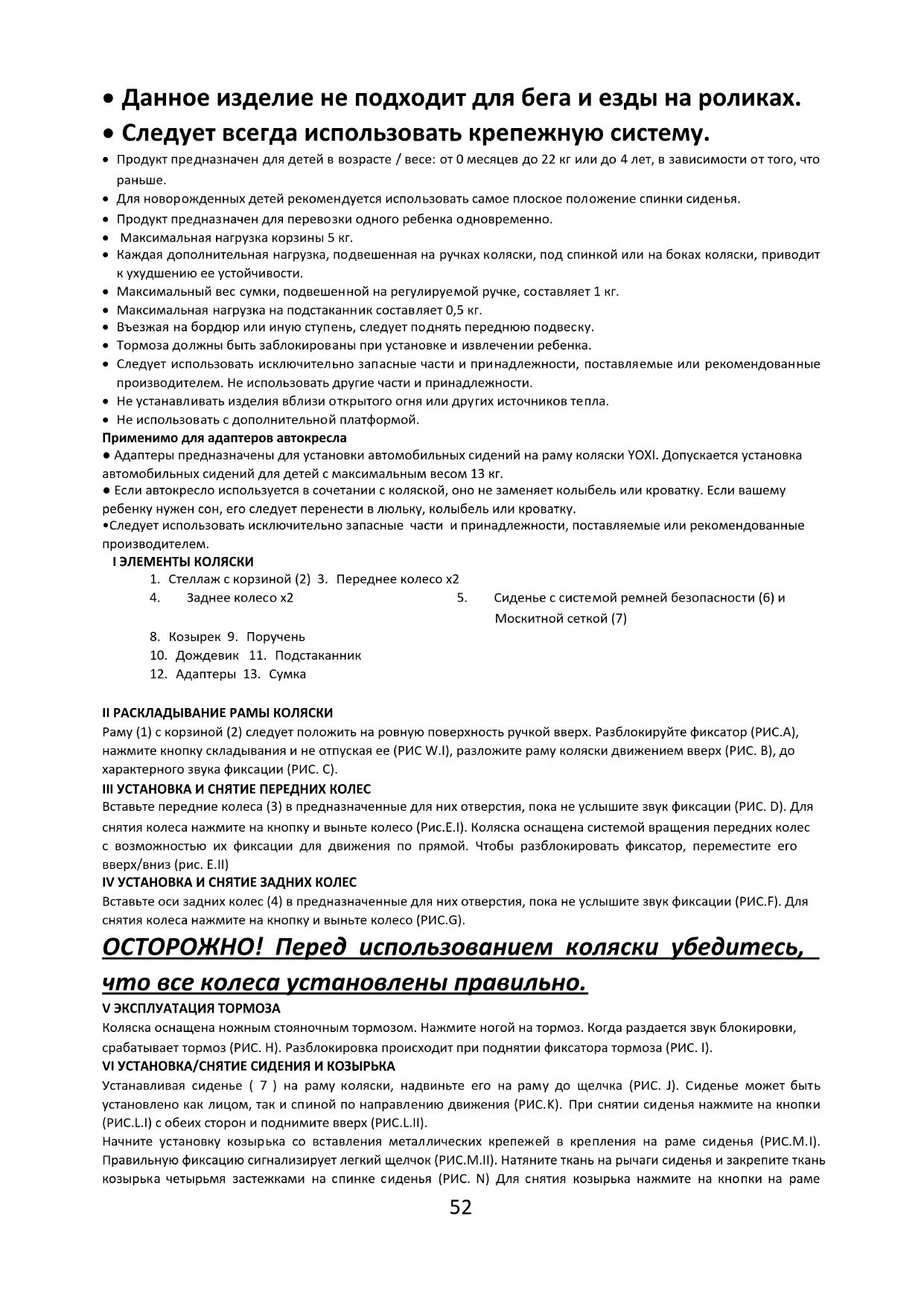 II РАСКЛАДЫВАНИЕ РАМЫ КОЛЯСКИ Раму (1) с корзиной (2) следует положить на ровную поверхность ручкой вверх. Разблокируйте фиксатор (РИС.A), нажмите кнопку складывания и не отпуская ее (РИС W.I), разложите раму коляски движением вверх (РИС. B), до характерного звука фиксации (РИС. C). III УСТАНОВКА И СНЯТИЕ ПЕРЕДНИХ КОЛЕС Вставьте передние колеса (3) в предназначенные для них отверстия, пока не услышите звук фиксации (РИС. D). Для снятия колеса нажмите на кнопку и выньте колесо (Рис.E.I). Коляска оснащена системой вращения передних колес с возможностью их фиксации для движения по прямой. Чтобы разблокировать фиксатор, переместите его вверх/вниз (рис. E.II) IV УСТАНОВКА И СНЯТИЕ ЗАДНИХ КОЛЕС Вставьте оси задних колес (4) в предназначенные для них отверстия, пока не услышите звук фиксации (РИС.F). Для снятия колеса нажмите на кнопку и выньте колесо (РИС.G). ОСТОРОЖНО! Перед использованием коляски убедитесь, что все колеса установлены правильно. V ЭКСПЛУАТАЦИЯ ТОРМОЗА Коляска оснащена ножным стояночным тормозом. Нажмите ногой на тормоз. Когда раздается звук блокировки, срабатывает тормоз (РИС. H). Разблокировка происходит при поднятии фиксатора тормоза (РИС. I). VI УСТАНОВКА/СНЯТИЕ СИДЕНИЯ И КОЗЫРЬКА Устанавливая сиденье ( 7 ) на раму коляски, надвиньте его на раму до щелчка (РИС. J). Сиденье может быть установлено как лицом, так и спиной по направлению движения (РИС.K). При снятии сиденья нажмите на кнопки (РИС.L.I) с обеих сторон и поднимите вверх (РИС.L.II). Начните установку козырька со вставления металлических крепежей в крепления на раме сиденья (РИС.M.I). Правильную фиксацию сигнализирует легкий щелчок (РИС.M.II). Натяните ткань на рычаги сиденья и закрепите ткань козырька четырьмя застежками на спинке сиденья (РИС. N) Для снятия козырька нажмите на кнопки на раме53 сиденья, расположенные с внутренней стороны креплений козырька, и выньте металлические крепежи из креплений (РИС. O) ВНИМАНИЕ! Установите козырек перед использованием