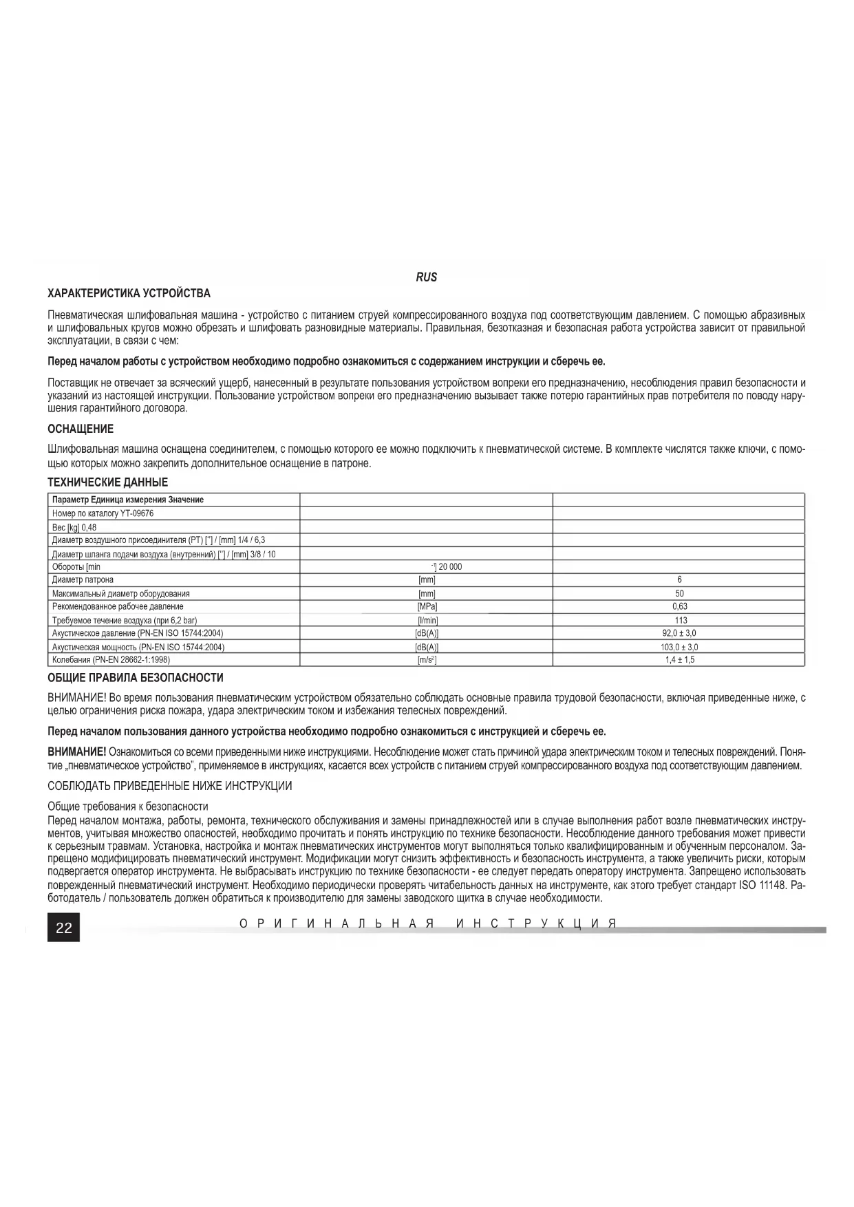 ] 1,4 ± 1,5 ОБЩИЕ ПРАВИЛА БЕЗОПАСНОСТИ ВНИМАНИЕ! Во время пользования пневматическим устройством обязательно соблюдать основные правила трудовой безопасности, включая приведенные ниже, с целью ограничения риска пожара, удара электрическим током и избежания телесных повреждений. Перед началом пользования данного устройства необходимо подробно ознакомиться с инструкцией и сберечь ее. ВНИМАНИЕ! Ознакомиться со всеми приведенными ниже инструкциями. Несоблюдение может стать причиной удара электрическим током и телесных повреждений. Поня- тие „пневматическое устройство”, применяемое в инструкциях, касается всех устройств с питанием струей компрессированного воздуха под соответствующим давлением. СОБЛЮДАТЬ ПРИВЕДЕННЫЕ НИЖЕ ИНСТРУКЦИИ Общие требования к безопасности Перед началом монтажа, работы, ремонта, технического обслуживания и замены принадлежностей или в случае выполнения работ возле пневматических инстру- ментов, учитывая множество опасностей, необходимо прочитать и понять инструкцию по технике безопасности. Несоблюдение данного требования может привести к серьезным травмам. Установка, настройка и монтаж пневматических инструментов могут выполняться только квалифицированным и обученным персоналом. За- прещено модифицировать пневматический инструмент. Модификации могут снизить эффективность и безопасность инструмента, а также увеличить риски, которым подвергается оператор инструмента. Не выбрасывать инструкцию по технике безопасности - ее следует передать оператору инструмента. Запрещено использовать поврежденный пневматический инструмент. Необходимо периодически проверять читабельность данных на инструменте, как этого требует стандарт ISO 11148. Ра- ботодатель / пользователь должен обратиться к производителю для замены заводского щитка в случае необходимости.23 RUS ОРИГИНАЛЬНАЯ ИНСТРУКЦИЯ Опасности, связанные с выбрасываемыми элементами Повреждение обрабатываемого предмета, принадлежностей или даже сменного рабочего инструмента может стать причиной выброса элемента на высокой скоро- сти. Всегда необходимо использовать ударопрочную защиту для глаз. Степень защиты следует подбирать в зависимости от выполняемой работы. Убедиться, что обрабатываемый предмет надежно закреплен. Регулярно проверять соответствие фактической скорости вращения инструмента с номинальной скоростью, указанной на заводском щитке. Проверка производиться без сменных рабочих инструментов и в соответствии с инструкциями производителя. Убедиться, что искры и осколки, образующиеся во время работы, не представляют опасности. Отсоединить устройство от источника питания перед техническим обслуживанием или заменой смен- ного рабочего инструмента. Также всегда следует учитывать риски, которым могут подвергаться посторонние лица. Опасности, связанные с запутыванием Запутывание может стать причиной удушья, оскальпирования и/или травмы, если свободная одежда, украшения, волосы и перчатки не удерживать вдали от инстру- ментов или принадлежностей. Опасности, связанные с работой Для предотвращения порезов рук и других частей тела следует избегать контакта с вращающимся шпинделем и сменными рабочими инструментами. Во время использо- вания инструмента руки оператора могут подвергаться следующим опасностям: дробление, удар