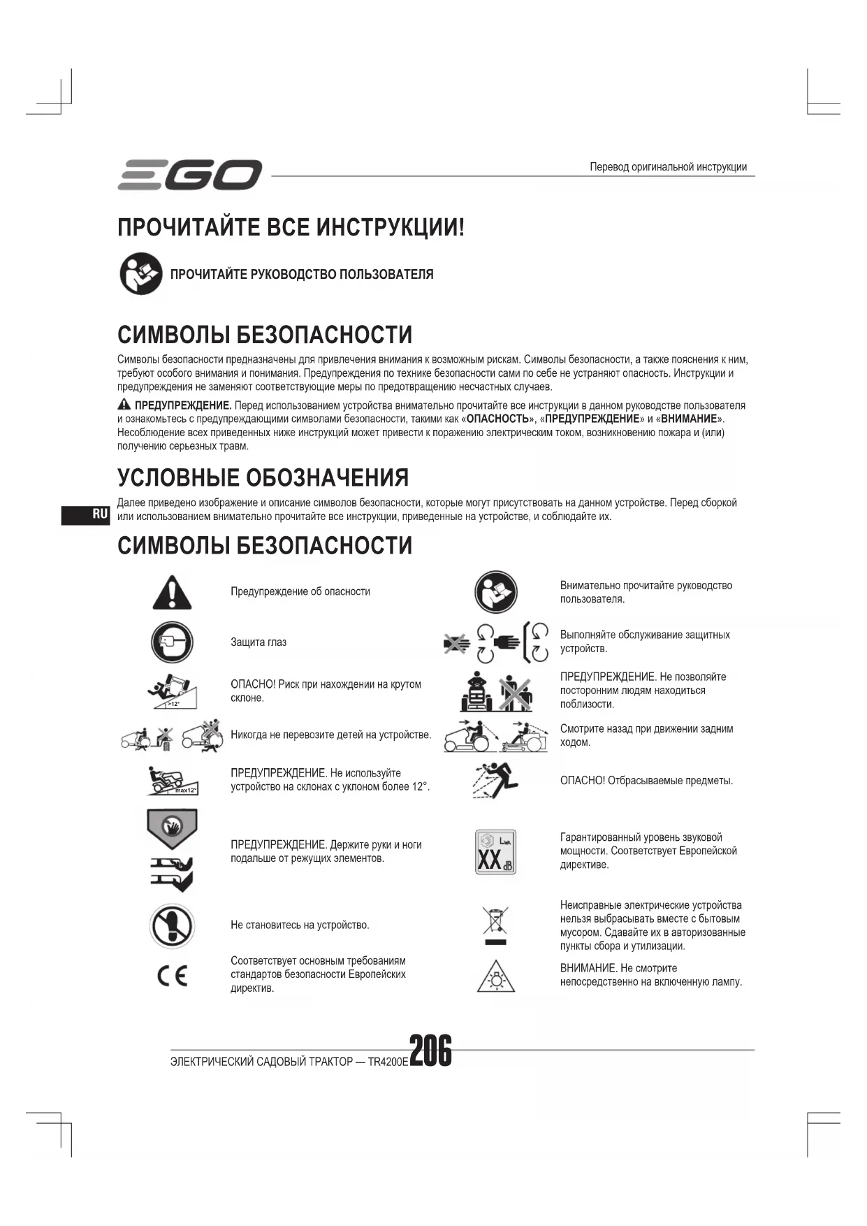 LCD- skjerm Beskrivelse Traktorstatus- indikator Lydindikator Årsaken Løsning Ikonet for hvert opptatt batterirom og varselikonet blinker hvert halve sekund. Blinker rødt Fortsetter å pipe Bladmotoren ble avbrutt i drift og kraftuttaksbryteren er ikke satt til av-posisjon. Traktoren vil slutte å fungere umiddelbart. Operatøren bør transportere traktoren til batteriets ladeområde for lading. CCS-ikonet lyser på LCD-skjermen Solid grønn Nei Traktoren fortsetter fremover med en innstilt hastighet uten å trenge på gasspedalen. Dette er normal drift. Om nødvendig, slå av CCS-funksjonen ved å følge avsnittet «For å stoppe (avslutte) Cruise Control (CCS)» i håndboken. CCS-ikonet blinker på LCD-skjermen. AV Nei CCS-funksjonen (cruise control system) har sviktet. CCS-funksjonen kunne ikke stilles inn når traktoren kjører i svært lav hastighet eller kjører i revers. Parkeringsbremspedalen trykkes inn for å stoppe traktoren. Etter at parkeringsbremsen er sluppet, trykk på CCS-knappen og CCS-ikonet vil lyse på LCD-skjermen, eller gå ut av CCS-funksjonen ved å følge instruksjonene i avsnittet «For å stoppe (avslutte) Cruise Control (CCS)”. n/a n/a AV Fortsetter å pipe Traktoren parkeres i en skråning og føreren forlater traktoren uten å sette på parkeringsbremsen i parkeringsbremseposisjonen. Sett parkeringsbremsepedalen i parkeringsbremseposisjon. Parkeringsbremseikonet vil lyse og lydindikatoren slutter å pipe. OFF Ladeportfeil Solid RØD n/a Det er ingen strømforsyning. Sjekk vegguttaket om det følger med 220 V-240 V eller om stikkontakten er god. Solid RØD n/a Elektroniske feil, slik som ladeporten er i åpen krets, sikringen er gått, etc. Kontakt EGO kundeservicesenter for reparasjon. FEILKODEREFERANSE Beskrivelse Feilkode på LCD Lydindikator Løsning Venstre bladmotor svikter i rotasjon 509 Ett pip Inspiser bladet først. Hvis den er løsnet, stram bolten med anbefalt tiltrekkingsmoment. Ellers, kontakt EGO kundeservicesenter for reparasjon. Høyre bladmotor svikter i rotasjon 609 Ett pip MERKNAD: For andre feilkoder som dukket opp på LCD-skjermen, som kan indikere PCBA-feil, løs tilkobling, motorfeil på drivmotoren, bladmotorer osv., vennligst fjern alle batteripakker og sett dem inn igjen noen minutter senere for å starte traktoren på nytt. Hvis dette ikke løser problemet, vennligst noter feilkoden og kontakt EGO kundeservicesenter for reparasjon. GARANTI EGO GARANTIPOLITIKK Besøk nettstedet egopowerplus.eu for fullstendige vilkår og betingelser for EGO-garantipolicyen.RU ЭЛЕКТРИЧЕСКИЙ САДОВЫЙ ТРАКТОР — TR4200E206 ПРОЧИТАЙТЕ ВСЕ ИНСТРУКЦИИ! ПРОЧИТАЙТЕ РУКОВОДСТВО ПОЛЬЗОВАТЕЛЯ СИМВОЛЫ БЕЗОПАСНОСТИ Символы безопасности предназначены для привлечения внимания к возможным рискам. Символы безопасности, а также пояснения к ним, требуют особого внимания и понимания. Предупреждения по технике безопасности сами по себе не устраняют опасность. Инструкции и предупреждения не заменяют соответствующие меры по предотвращению несчастных случаев. ПРЕДУПРЕЖДЕНИЕ. Перед использованием устройства внимательно прочитайте все инструкции в данном руководстве пользователя и ознакомьтесь с предупреждающими символами безопасности, такими как «ОПАСНОСТЬ», «ПРЕДУПРЕЖДЕНИЕ» и «ВНИМАНИЕ». Несоблюдение всех приведенных ниже инструкций может привести к поражению электрическим током, возникновению пожара и (или) получению серьезных травм. УСЛОВНЫЕ ОБОЗНАЧЕНИЯ Далее приведено изображение и описание символов безопасности, которые могут присутствовать на данном устройстве. Перед сборкой или использованием внимательно прочитайте все инструкции, приведенные на устройстве, и соблюдайте их. СИМВОЛЫ БЕЗОПАСНОСТИ Предупреждение об опасностиВнимательно прочитайте руководство пользователя.Защита глазВыполняйте обслуживание защитных устройств.>12°ОПАСНО! Риск при нахождении на крутом склоне.ПРЕДУПРЕЖДЕНИЕ. Не позволяйте посторонним людям находиться поблизости.Никогда не перевозите детей на устройстве.Смотрите назад при движении задним ходом.max12°ПРЕДУПРЕЖДЕНИЕ. Не используйте устройство на склонах с уклоном более 12°.ОПАСНО! Отбрасываемые предметы.ПРЕДУПРЕЖДЕНИЕ. Держите руки и ноги подальше от режущих элементов. Гарантированный уровень звуковой мощности. Соответствует Европейской директиве.Не становитесь на устройство.Неисправные электрические устройства нельзя выбрасывать вместе с бытовым мусором. Сдавайте их в авторизованн