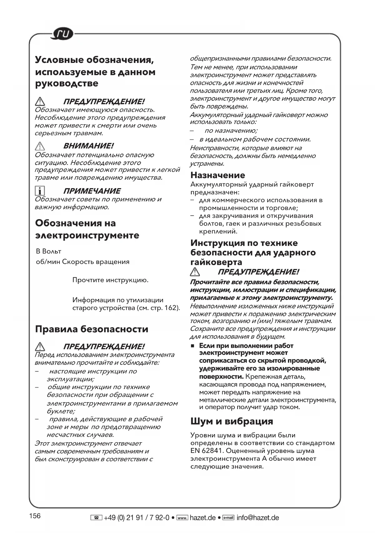 info@hazet.de -Декларация соответствия Мы с полной ответственностью заявляем, что изделие, описанное в разделе «Технические характеристики», соответствует следующим стандартам или нормативным документам: стандарт EN 62841 в соответствии с требованиями директив 2014/30/EU, 2006/42/EC, 2011/65/EU. Ответственный за техническую документацию: Отказ от ответственности Производитель и его представитель не несут ответственности за любой ущерб и упущенную выгоду в результате прерывания деятельности, вызванного изделием или непригодным для использования изделием. Производитель и его представитель не несут ответственности за любой ущерб, вызванный неправильным использованием устройства или использованием устройства с изделиями других производителей. Ответственный за техническую документацию: HAZET-WERK Hermann Zerver GmbH & Co. KG, Güldenwerther Bahnhofstraße 25 - 29 42857 Remscheid GERMANY i.V. Volker Grünberg Head of Quality Department (QD)