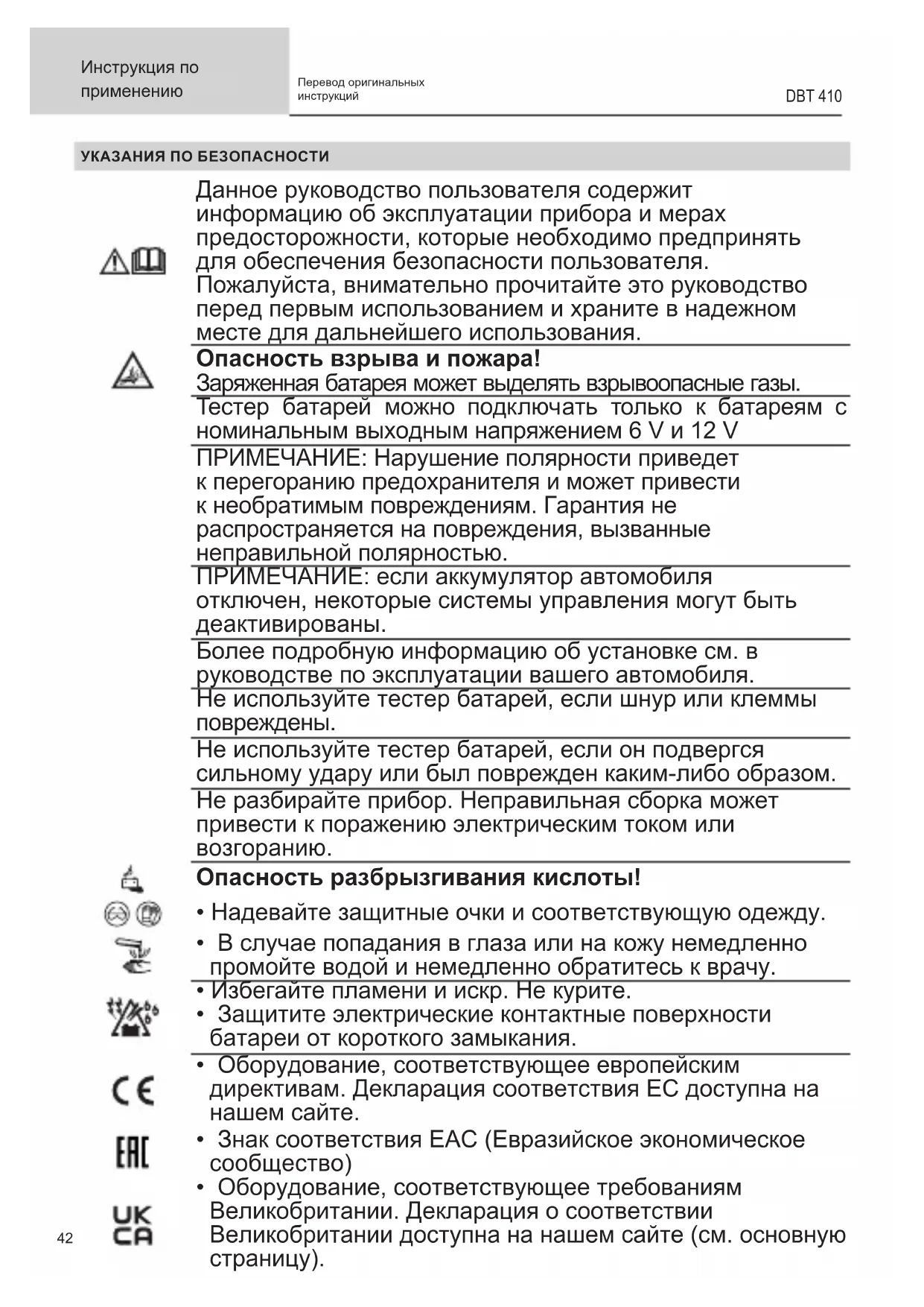 УКАЗАНИЯ ПО БЕЗОПАСНОСТИ Данное руководство пользователя содержит информацию об эксплуатации прибора и мерах предосторожности, которые необходимо предпринять для обеспечения безопасности пользователя. Пожалуйста, внимательно прочитайте это руководство перед первым использованием и храните в надежном месте для дальнейшего использования. Опасность взрыва и пожара! Заряженная батарея может выделять взрывоопасные газы. Тестер батарей можно подключать только к батареям с номинальным выходным напряжением 6 V и 12 V ПРИМЕЧАНИЕ: Нарушение полярности приведет к перегоранию предохранителя и может привести к необратимым повреждениям. Гарантия не распространяется на повреждения, вызванные неправильной полярностью. ПРИМЕЧАНИЕ: если аккумулятор автомобиля отключен, некоторые системы управления могут быть деактивированы. Более подробную информацию об установке см. в руководстве по эксплуатации вашего автомобиля. Не используйте тестер батарей, если шнур или клеммы повреждены. Не используйте тестер батарей, если он подвергся сильному удару или был поврежден каким-либо образом. Не разбирайте прибор. Неправильная сборка может привести к поражению электрическим током или возгоранию. Опасность разбрызгивания кислоты!