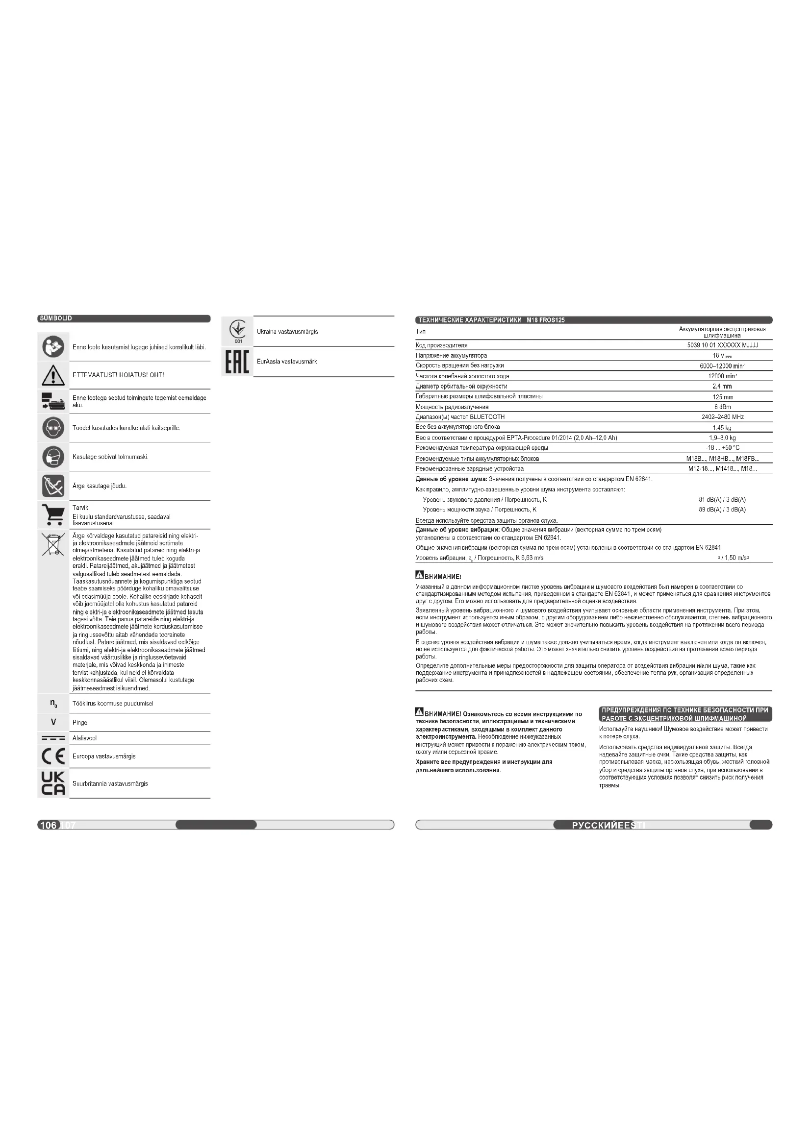 Определите дополнительные меры предосторожности для защиты оператора от воздействия вибрации и/или шума, такие как: поддержание инструмента и принадлежностей в надлежащем состоянии, обеспечение тепла рук, организация определенных рабочих схем. ВНИМАНИЕ! Ознакомьтесь со всеми инструкциями по технике безопасности, иллюстрациями и техническими характеристиками, входящими в комплект данного электроинструмента. Несоблюдение нижеуказанных инструкций может привести к поражению электрическим током, ожогу и/или серьезной травме. Храните все предупреждения и инструкции для дальнейшего использования. ПРЕДУПРЕЖДЕНИЯ ПО ТЕХНИКЕ БЕЗОПАСНОСТИ ПРИ РАБОТЕ С ЭКСЦЕНТРИКОВОЙ ШЛИФМАШИНОЙ Используйте наушники! Шумовое воздействие может привести к потере слуха. Использовать средства индивидуальной защиты. Всегда надевайте защитные очки. Такие средства защиты, как противопылевая маска, нескользящая обувь, жесткий головной убор и средства защиты органов слуха, при использовании в соответствующих условиях позволят снизить риск получения травмы.108 109 РУССКИЙ РУССКИЙ Защита литий-ионных аккумуляторов При очень высоком крутящем моменте, заедании, остановке и коротком замыкании, когда увеличивается потребление тока, изделие будет вибрировать в течение примерно 5 секунд, а индикатор заряда начнет мигать, после чего изделие выключится. Для перезапуска отпустите курок газа. В экстремальных условиях внутренняя температура аккумуляторного блока может стать слишком высокой. В