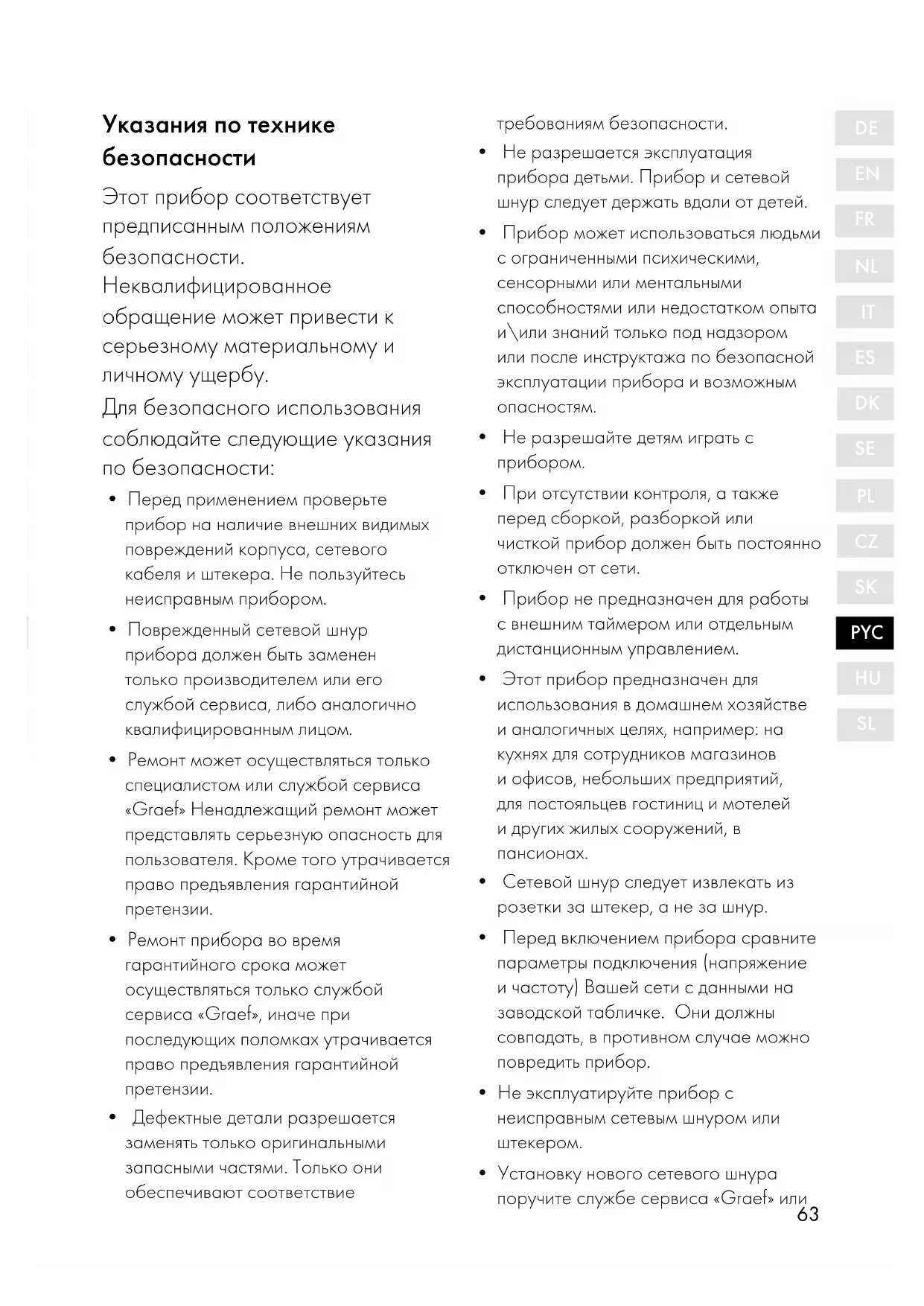 - Установку нового сетевого шнура поручите службе сервиса «Graef» или64 авторизованному специалисту.
