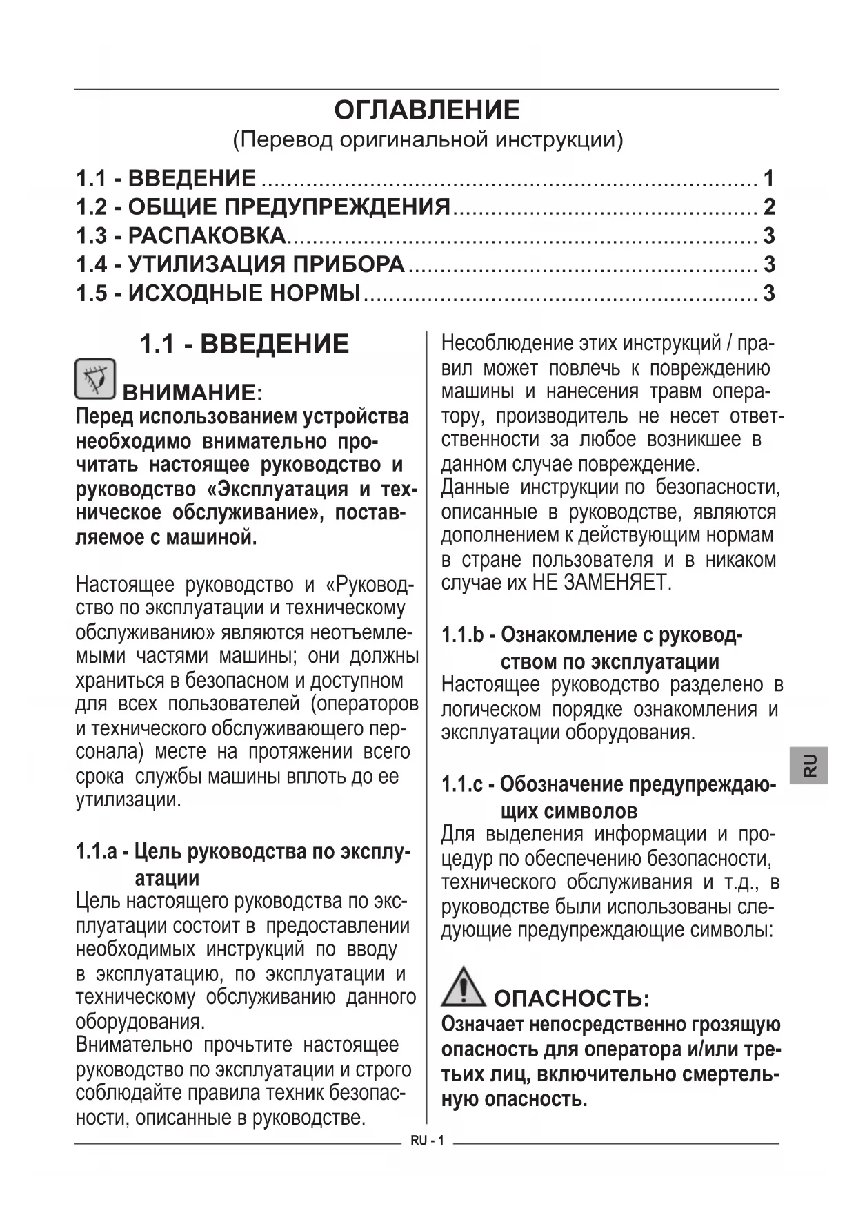 Цель настоящего руководства по экс- плуатации состоит в предоставлении необходимых инструкций по вводу в эксплуатацию, по эксплуатации и техническому обслуживанию данного оборудования. Внимательно прочьтите настоящее руководство по эксплуатации и строго соблюдайте правила техник безопас- ности, описанные в руководстве. Несоблюдение этих инструкций / пра- вил может повлечь к повреждению машины и нанесения травм опера- тору, производитель не несет ответ- ственности за любое возникшее в данном случае повреждение. Данные инструкции по безопасности, описанные в руководстве, являются дополнением к действующим нормам в стране пользователя и в никаком случае их НЕ ЗАМЕНЯЕТ.