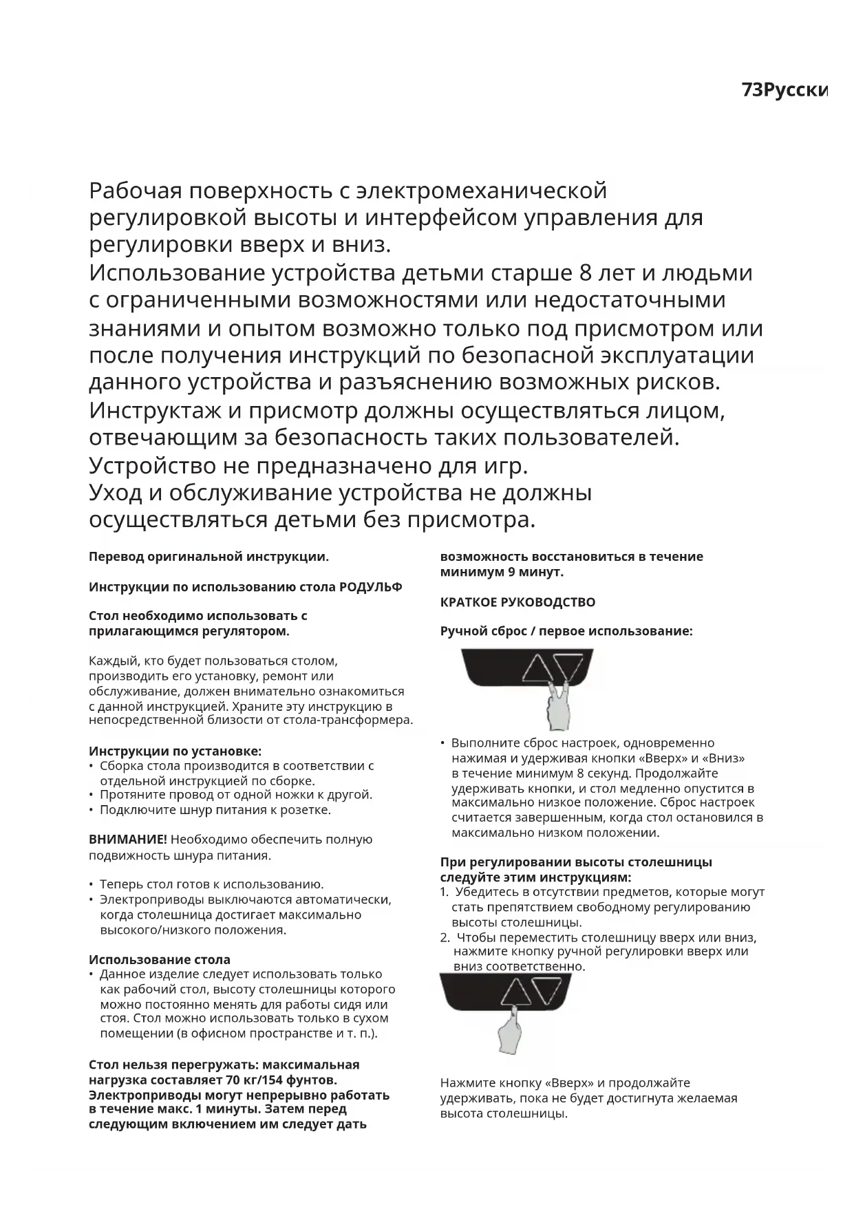 нажмите кнопку ручной регулировки вверх или вниз соответственно. Нажмите кнопку «Вверх» и продолжайте удерживать, пока не будет достигнута желаемая высота столешницы. Рабочая поверхность с электромеханической регулировкой высоты и интерфейсом управления для регулировки вверх и вниз. Использование устройства детьми старше 8 лет и людьми с ограниченными возможностями или недостаточными знаниями и опытом возможно только под присмотром или после получения инструкций по безопасной эксплуатации данного устройства и разъяснению возможных рисков. Инструктаж и присмотр должны осуществляться лицом, отвечающим за безопасность таких пользователей. Устройство не предназначено для игр. Уход и обслуживание устройства не должны осуществляться детьми без присмотра.74 Нажмите кнопку «Вниз» и продолжайте удерживать, пока не будет достигнута желаемая высота столешницы. Возможностьмаксимальногохода