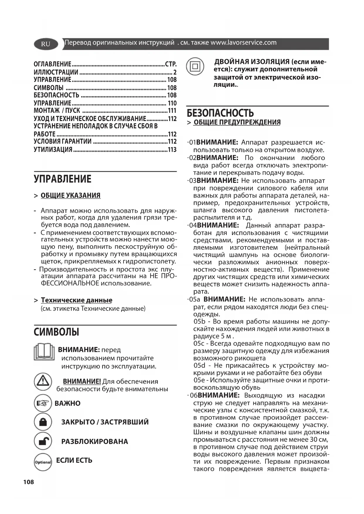 - 06ВНИМАНИЕ: Выходящую из насадки струю не следует направлять на механи- ческие узлы с консистентной смазкой, т.к. в противном случае произойдет рассеи- вание смазки по окружающему участку. Шины и воздушные клапаны шин должны промываться с расстояния не менее 30 см, в противном случае под действием струи воды высокого давления может произой- ти их повреждение. Первым признаком такого повреждения является выцвета- ОГЛАВЛЕНИЕ ............................................................. С ТР. ИЛЛЮСТРАЦИИ ............................................................. 2 УПРАВЛЕНИЕ ..............................................................108 СИМВОЛЫ .................................................................. 108 БЕЗОПАСНОСТЬ ........................................................ 108 УПРАВЛЕНИЕ .............................................................. 110 МОНТАЖ / ПУСК ........................................................111 УХОД И ТЕХНИЧЕСКОЕ ОБСЛУЖИВАНИЕ ..............112 УСТРАНЕНИЕ НЕПОЛАДОК В СЛУЧАЕ СБОЯ В РАБОТЕ .........................................................................112 УСЛОВИЯ ГАРАНТИИ .................................................112 УТИЛИЗАЦИЯ ..............................................................113RU