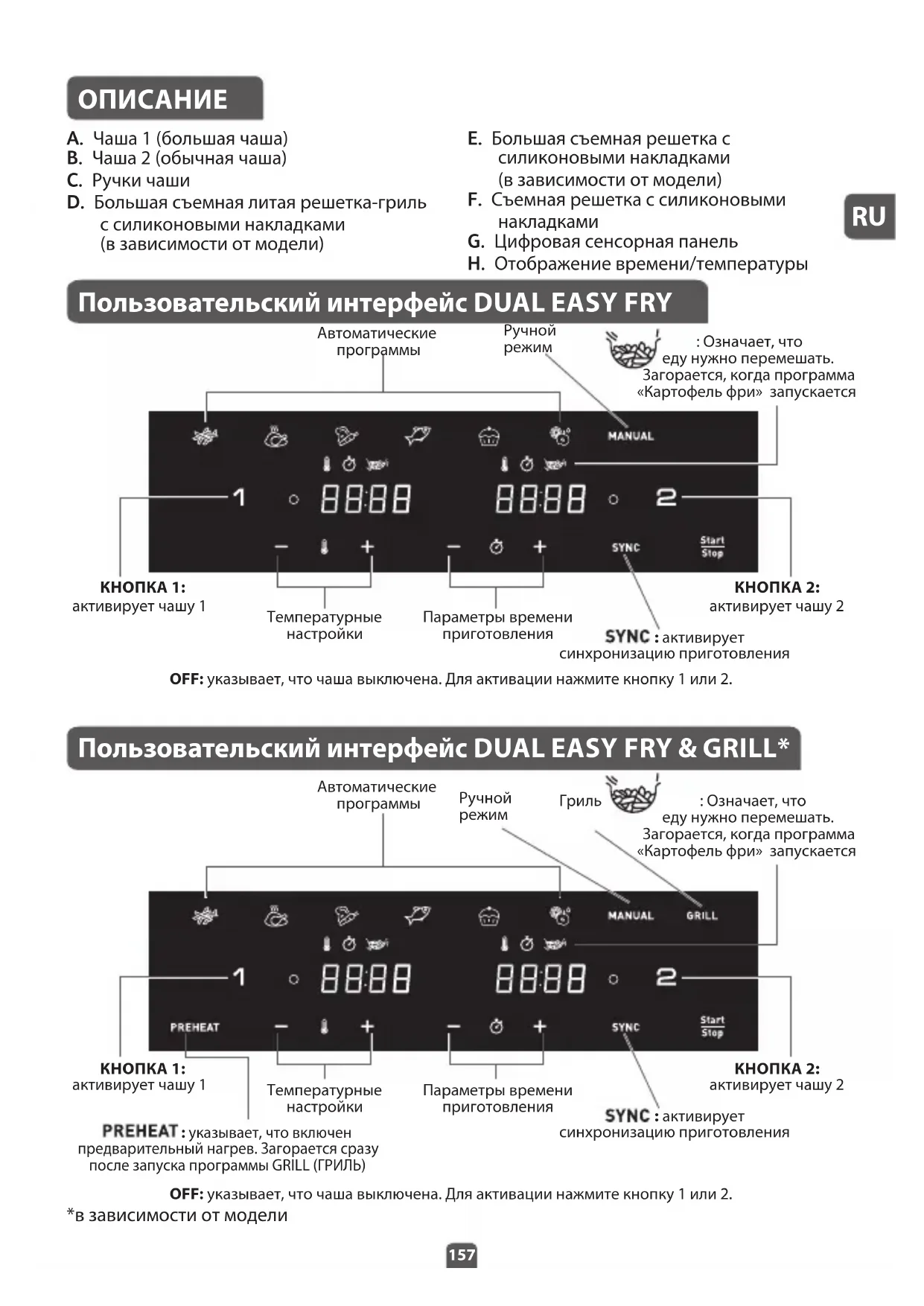 G. Цифровая сенсорная панель H. Отображение времени/температуры Пользовательский интерфейс DUAL EASY FRY Пользовательский интерфейс DUAL EASY FRY & GRILL* OFF: указывает, что чаша выключена. Для активации нажмите кнопку 1 или 2. OFF: указывает, что чаша выключена. Для активации нажмите кнопку 1 или 2. : указывает, что включен предварительный нагрев. Загорается сразу после запуска программы GRILL (ГРИЛЬ) *в зависимости от модели Автоматические