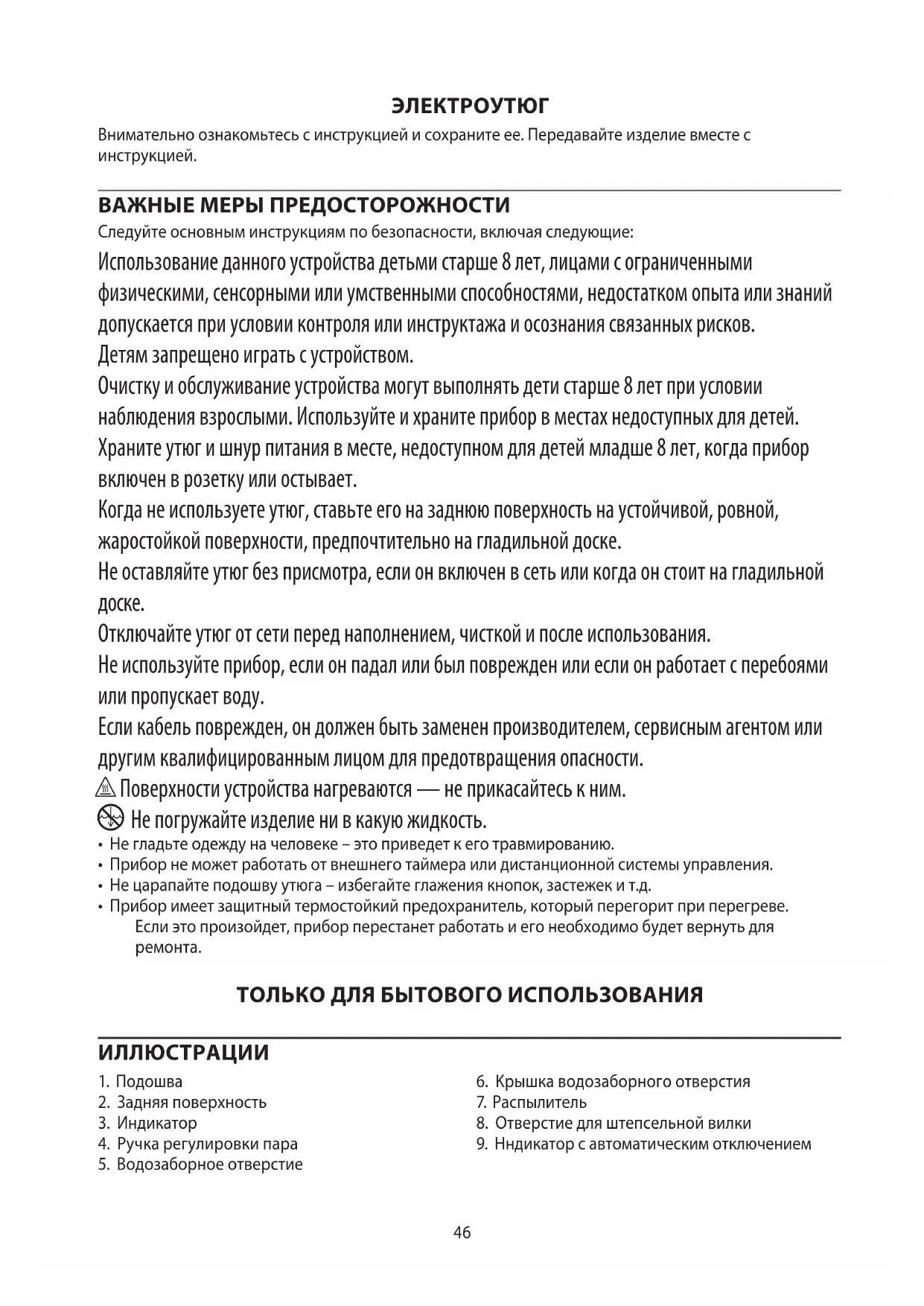AE46 ЭЛЕКТРОУТЮГ Внимательно ознакомьтесь с инструкцией и сохраните ее. Передавайте изделие вместе с инструкцией. ВАЖНЫЕ МЕРЫ ПРЕДОСТОРОЖНОСТИ Следуйте основным инструкциям по безопасности, включая следующие: Использование данного устройства детьми старше 8 лет, лицами с ограниченными физическими, сенсорными или умственными способностями, недостатком опыта или знаний допускается при условии контроля или инструктажа и осознания связанных рисков. Детям запрещено играть с устройством. Очистку и обслуживание устройства могут выполнять дети старше 8 лет при условии наблюдения взрослыми. Используйте и храните прибор в местах недоступных для детей. Храните утюг и шнур питания в месте, недоступном для детей младше 8 лет, когда прибор включен в розетку или остывает. Когда не используете утюг, ставьте его на заднюю поверхность на устойчивой, ровной, жаростойкой поверхности, предпочтительно на гладильной доске. Не оставляйте утюг без присмотра, если он включен в сеть или когда он стоит на гладильной