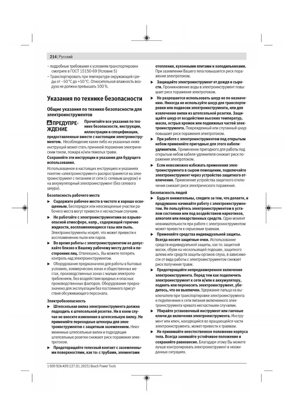 – при разгрузке/погрузке не допускается использова- ние любого вида техники, работающей по принципу зажима упаковки Bosch Power Tools 1 609 92A A99 | (27.01.2025)214 | Русский – подробные требования к условиям транспортировки смотрите в ГОСТ15150-69 (Условие5) – Транспортировать при температуре окружающей сре- ды от −50°С до +50°С. Относительная влажность воз- духа не должна превышать 100%. Указания по технике безопасности Общие указания по технике безопасности для электроинструментов