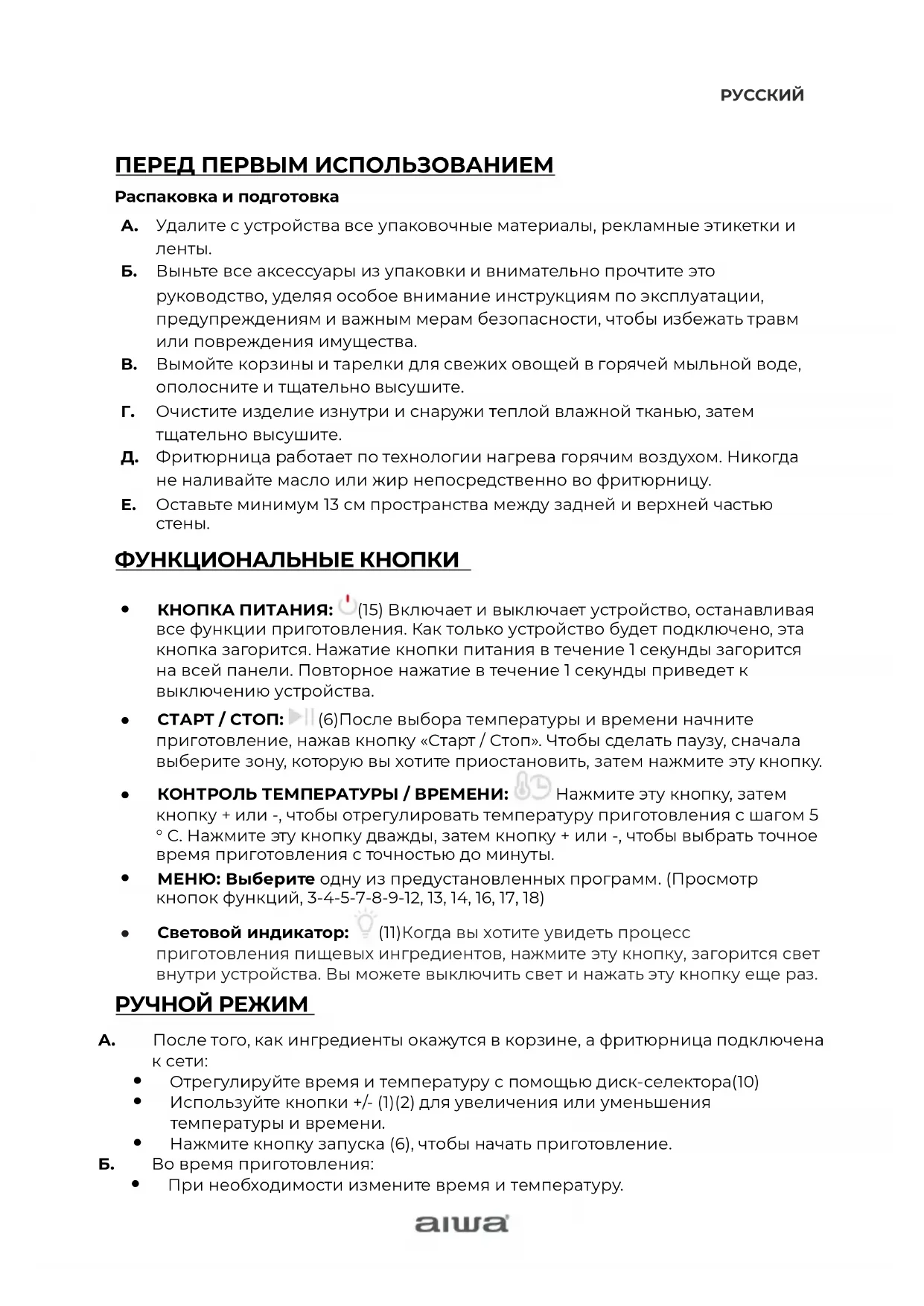 Б. Выньте все аксессуары из упаковки и внимательно прочтите это руководство, уделяя особое внимание инструкциям по эксплуатации, предупреждениям и важным мерам безопасности, чтобы избежать травм или повреждения имущества. В. Вымойте корзины и тарелки для свежих овощей в горячей мыльной воде, ополосните и тщательно высушите. Г. Очистите изделие изнутри и снаружи теплой влажной тканью, затем тщательно высушите. Д. Фритюрница работает по технологии нагрева горячим воздухом. Никогда не наливайте масло или жир непосредственно во фритюрницу. Е. Оставьте минимум 13 см пространства между задней и верхней частью