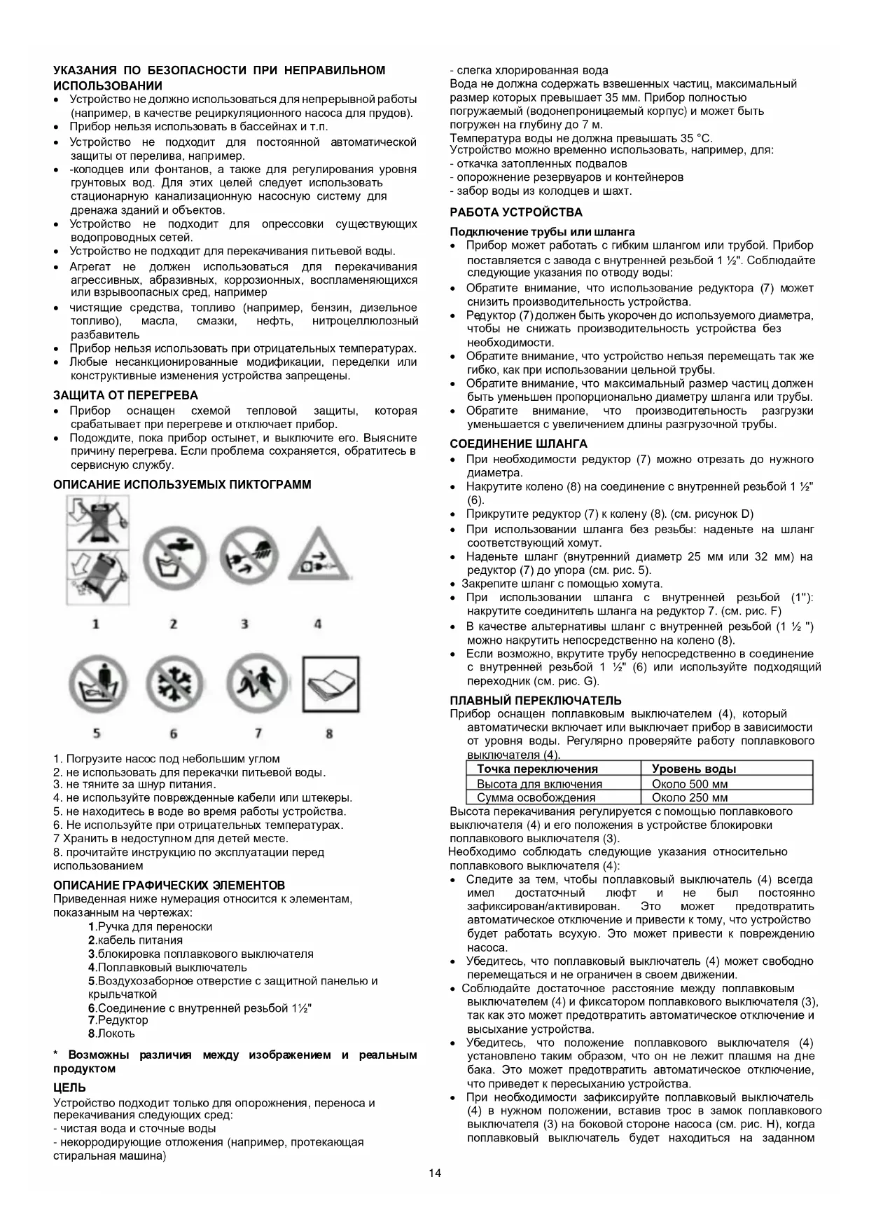 - Устройство не должно использоваться для непрерывной работы (например, в качестве рециркуляционного насоса для прудов).