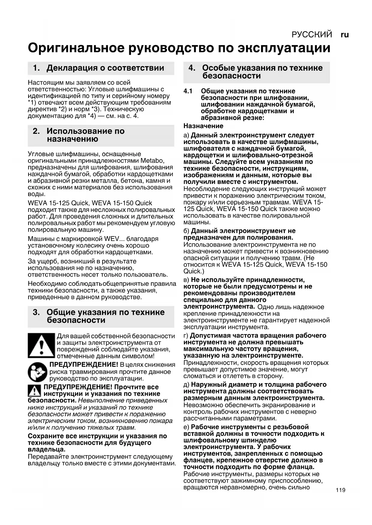 а) Данный электроинструмент следует использовать в качестве шлифмашины, шлифователя с наждачной бумагой, кардощетки и шлифовально-отрезной машины. Следуйте всем указаниям по технике безопасности, инструкциям, изображениям и данным, которые вы получили вместе с инструментом. Несоблюдение следующих инструкций может привести к поражению электрическим током, пожару и/или серьезным травмам. WEVA 15- 125 Quick, WEVA 15-150 Quick также можно использовать в качестве полировальной
