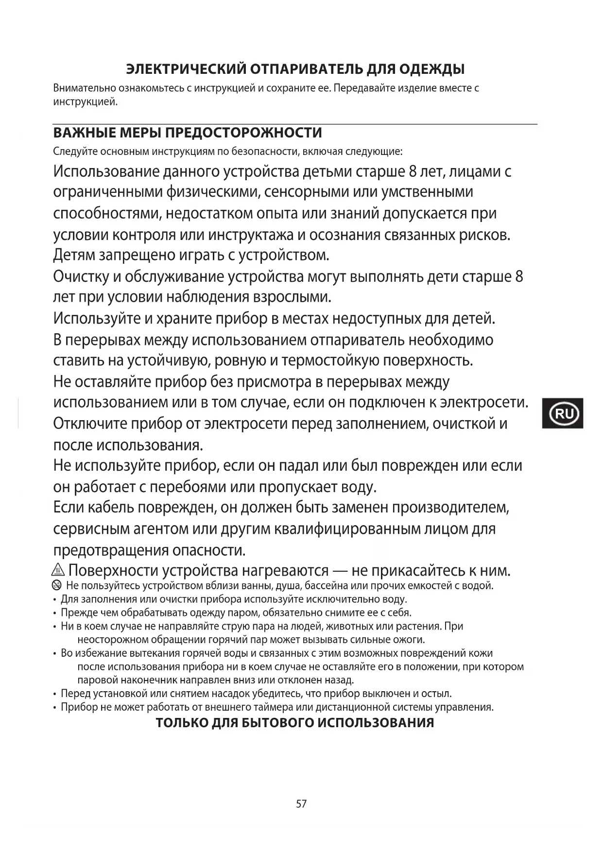 Jotta vältettäisiin vaarallisista aineista ympäristölle ja terveydelle koituvat haitat, näillä symboleilla varustettuja laitteita sekä ladattavia ja kertakäyttöisiä paristoja ei saa hävittää lajittelemattomana sekajätteenä. Hävitä sähkö- ja elektroniikkatuotteet sekä, mikäli sovellettavissa, ladattavat ja kertakäyttöiset paristot asianmukaiseen viralliseen kierrätys-/keräilypisteeseen.57 ЭЛЕКТРИЧЕСКИЙ ОТПАРИВАТЕЛЬ ДЛЯ ОДЕЖДЫ Внимательно ознакомьтесь с инструкцией и сохраните ее. Передавайте изделие вместе с инструкцией. ВАЖНЫЕ МЕРЫ ПРЕДОСТОРОЖНОСТИ Следуйте основным инструкциям по безопасности, включая следующие: Использование данного устройства детьми старше 8 лет, лицами с ограниченными физическими, сенсорными или умственными способностями, недостатком опыта или знаний допускается при условии контроля или инструктажа и осознания связанных рисков. Детям запрещено играть с устройством. Очистку и обслуживание устройства могут выполнять дети старше 8 лет при условии наблюдения взрослыми. Используйте и храните прибор в местах недоступных для детей. В перерывах между использованием отпариватель необходимо ставить на устойчивую, ровную и термостойкую поверхность. Не оставляйте прибор без присмотра в перерывах между использованием или в том случае, если он подключен к электросети. Отключите прибор от электросети перед заполнением, очисткой и после использования. Не используйте прибор, если он падал или был поврежден или если он работает с перебоями или пропускает воду. Если кабель поврежден, он должен быть заменен производителем, сервисным агентом или другим квалифицированным лицом для предотвращения опасности. h Поверхности устройства нагреваются — не прикасайтесь к ним. b Не пользуйтесь устройством вблизи ванны, душа, бассейна или прочих емкостей с водой.