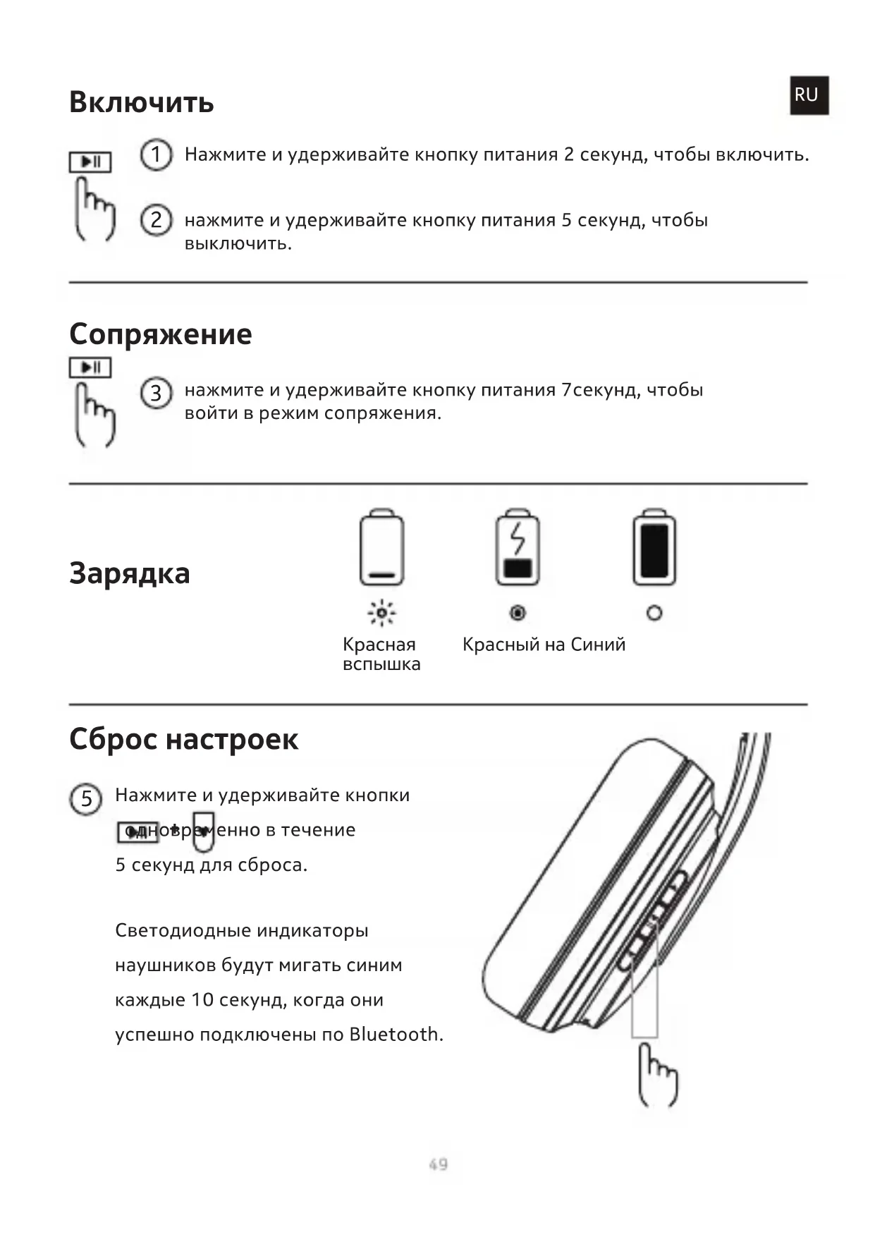 нажмите и удерживайте кнопку питания 7секунд, чтобы войти в режим сопряжения. Сброс настроек Нажмите и удерживайте кнопки одновременно в течение 5 секунд для сброса.