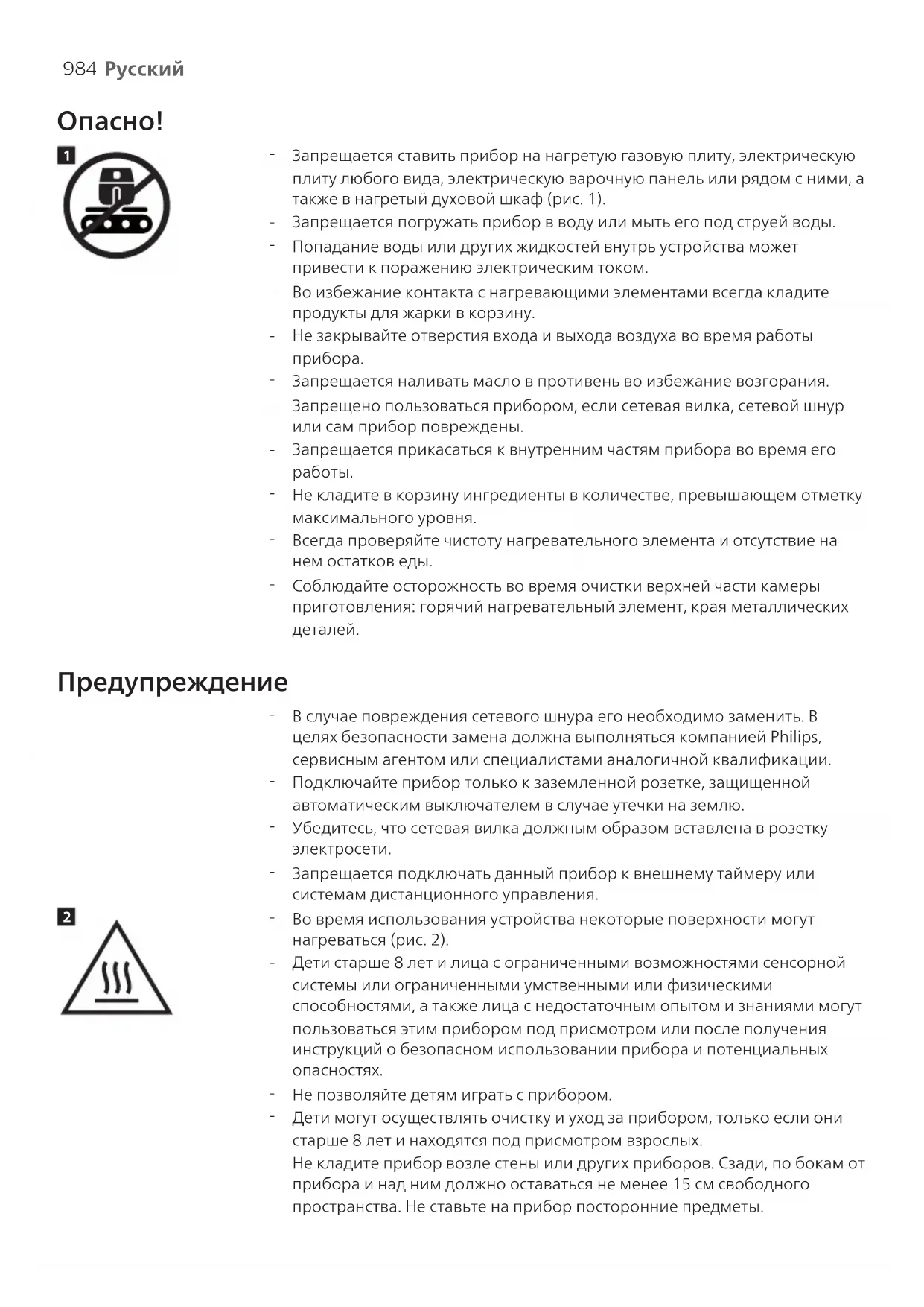 Перед первым использованием Важная информация. При первом использовании аэрогриля вы можете заметить дым и странный запах. Это нормальное явление, которое пропадет в течение нескольких минут. Внимание! Этот аэрогриль работает за счет горячего воздуха. Не наливайте масло, фритюр и другие жидкости в противень. Внимание! Не прикасайтесь к горячим поверхностям. Удерживайте горячий противень термостойкими ухватками. Внимание! Прибор предназначен только для домашнего использования. Примечание. Предварительно нагревать прибор необязательно. 1 Удалите все упаковочные материалы. 2 Снимите с прибора все наклейки и ярлыки (если имеются). 3 Тщательно очистите прибор перед первым использованием. Подготовка к использованию 1 Прибор необходимо ставить на ровную поверхность, устойчивую к высоким температурам. Убедитесь, что на столе достаточно места для аэрогриля с выдвинутым противнем. 2 Оставляйте не менее 15см свободного места сзади от прибора. Примечание. Во время приготовления через специальные отверстия выходит горячий пар. Лицо и руки должны находиться на безопасном расстоянии от пара и выходных отверстий. Разместите устройство на расстоянии не менее 15см от стены и не размещайте его так, чтобы вентиляционные отверстия были направлены прямо на розетку электросети. Примечание. Не накрывайте прибор и не ставьте возле него посторонние предметы. Это может заблокировать поток воздуха и повлиять на результат приготовления. Примечание. Не ставьте аэрогриль рядом с другим кухонным прибором, вплотную к стене или под кухонным шкафом, так как из-за горячего пара может сконденсироваться влага и начать стекать по поверхностям.995