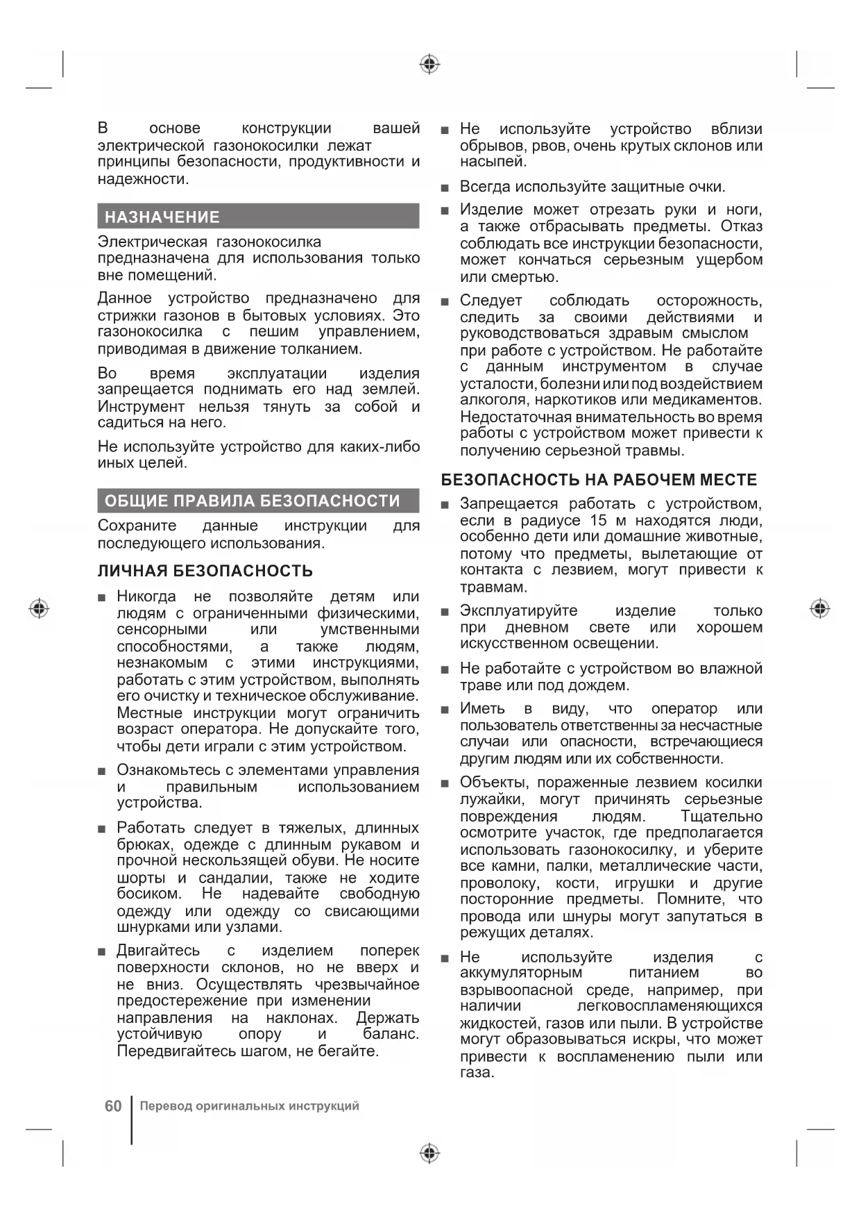 ■ Запрещается тянуть за кабель питания для поднятия или перемещения изделия. ■ Запрещается тянуть за кабель питания, чтобы отключить его от сети. ■ Не раскладывайте кабель питания вблизи источников тепла, емкостей с маслом и острых предметов. ■ Убедитесь, что напряжение является правильным для вашего изделия. В паспортной табличке изделия указано его номинальное напряжение. Запрещается подключать устройство к сети переменного тока, напряжение которой отличается от указанного. ПРЕДОСТЕРЕЖЕНИЯ ОТНОСИТЕЛЬНО БЕЗОПАСНОГО ПОЛЬЗОВАНИЯ ГАЗОНОКОСИЛКИ ■ Перед использованием всегда осматривайте изделие на предмет износа и повреждения лезвий, зажимных болтов и режущего блока. Замените изношенные или поврежденные режущие лезвия и болты в комплекте, чтобы обеспечить балансировку.62 Перевод оригинальных инструкций ■ Обратитесь в авторизованный сервисный центр для замены поврежденных или нечитаемых этикеток изделия. ■ Не тяните устройство назад без крайней необходимости. Если вам потребуется отодвинуть устройство от стены или иного ограждения, сначала посмотрите под ноги и назад, чтобы не повредить себе ноги при его перемещении. ■ Выключите изделие и дождитесь остановки лезвия в случае, если изделие необходимо наклонить для преодоления любых поверхностей, кроме травяных, а также при его транспортировке в рабочую зону или из нее. ■ Запрещается использовать изделие с дефектными щитками или экранами, а также без защитных устройств, таких как дефлекторы и травосборники. ■ Запрещается наклонять изделие при запуске или во время работы двигателя. При абсолютной необходимости можно поднять переднюю часть газонокосилки для облегчения пуска не более, чем на 5 см. Для этого нажмите на ручку управления. Перед началом стрижки всегда возвращайте газонокосилку в исходное положение, при этом все колеса должны стоять на земле. При наклоне газонокосилки лезвие открывается, что увеличивает риск отбрасывания предметов и случайного соприкосновения с лезвием. ■ Не запускайте изделие, стоя перед отверстием для выгрузки травы. ■ При запуске изделия оператор должен находиться за ручками в безопасной зоне. Запрещается запускать устройство, если не выполнены указанные ниже