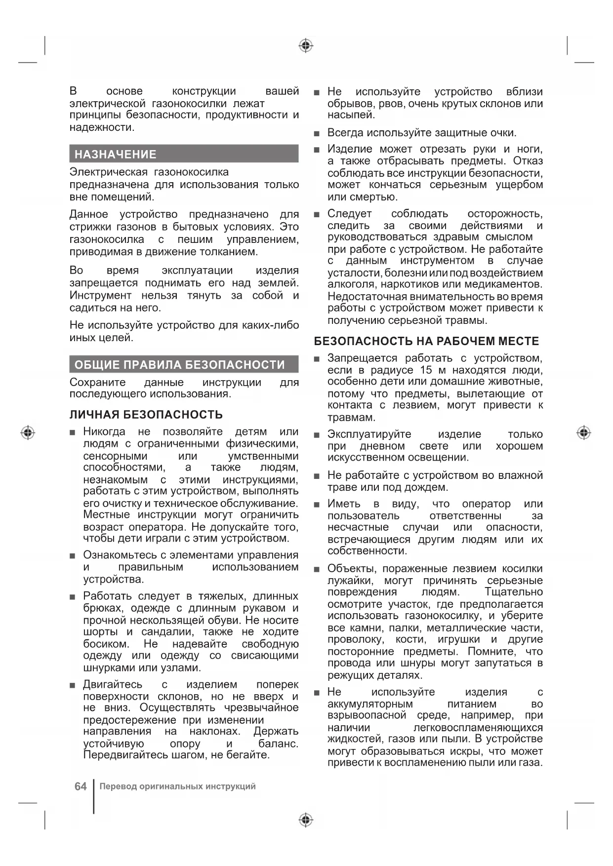 ■ Запрещается тянуть за кабель питания для поднятия или перемещения изделия. ■ Запрещается тянуть за кабель питания, чтобы отключить его от сети. ■ Не раскладывайте кабель питания вблизи источников тепла, емкостей с маслом и острых предметов. ■ Убедитесь, что напряжение является правильным для вашего изделия. В паспортной табличке изделия указано его номинальное напряжение. Запрещается подключать устройство к сети переменного тока, напряжение которой отличается от указанного. ПРЕДОСТЕРЕЖЕНИЯ ОТНОСИТЕЛЬНО БЕЗОПАСНОГО ПОЛЬЗОВАНИЯ ГАЗОНОКОСИЛКИ ■ Перед использованием всегда осматривайте изделие на предмет износа и повреждения лезвий, зажимных болтов и режущего блока. Замените изношенные или поврежденные режущие лезвия и болты в комплекте, чтобы обеспечить балансировку.66 Перевод оригинальных инструкций ■ Обратитесь в авторизованный сервисный центр для замены поврежденных или нечитаемых этикеток изделия. ■ Не тяните устройство назад без крайней необходимости. Если вам потребуется отодвинуть устройство от стены или иного ограждения, сначала посмотрите под ноги и назад, чтобы не повредить себе ноги при его перемещении. ■ Выключите изделие и дождитесь остановки лезвия в случае, если изделие необходимо наклонить для преодоления любых поверхностей, кроме травяных, а также при его транспортировке в рабочую зону или из нее. ■ Запрещается использовать изделие с дефектными щитками или экранами, а также без защитных устройств, таких как дефлекторы и травосборники. ■ Запрещается наклонять изделие при запуске или во время работы двигателя. При абсолютной необходимости можно поднять переднюю часть газонокосилки для облегчения пуска не более, чем на 5 см. Для этого нажмите на ручку управления. Перед началом стрижки всегда возвращайте газонокосилку в исходное положение, при этом все колеса должны стоять на земле. При наклоне газонокосилки лезвие открывается, что увеличивает риск отбрасывания предметов и случайного соприкосновения с лезвием. ■ Не запускайте изделие, стоя перед отверстием для выгрузки травы. ■ При запуске изделия оператор должен находиться за ручками в безопасной зоне. Запрещается запускать устройство, если не выполнены указанные ниже