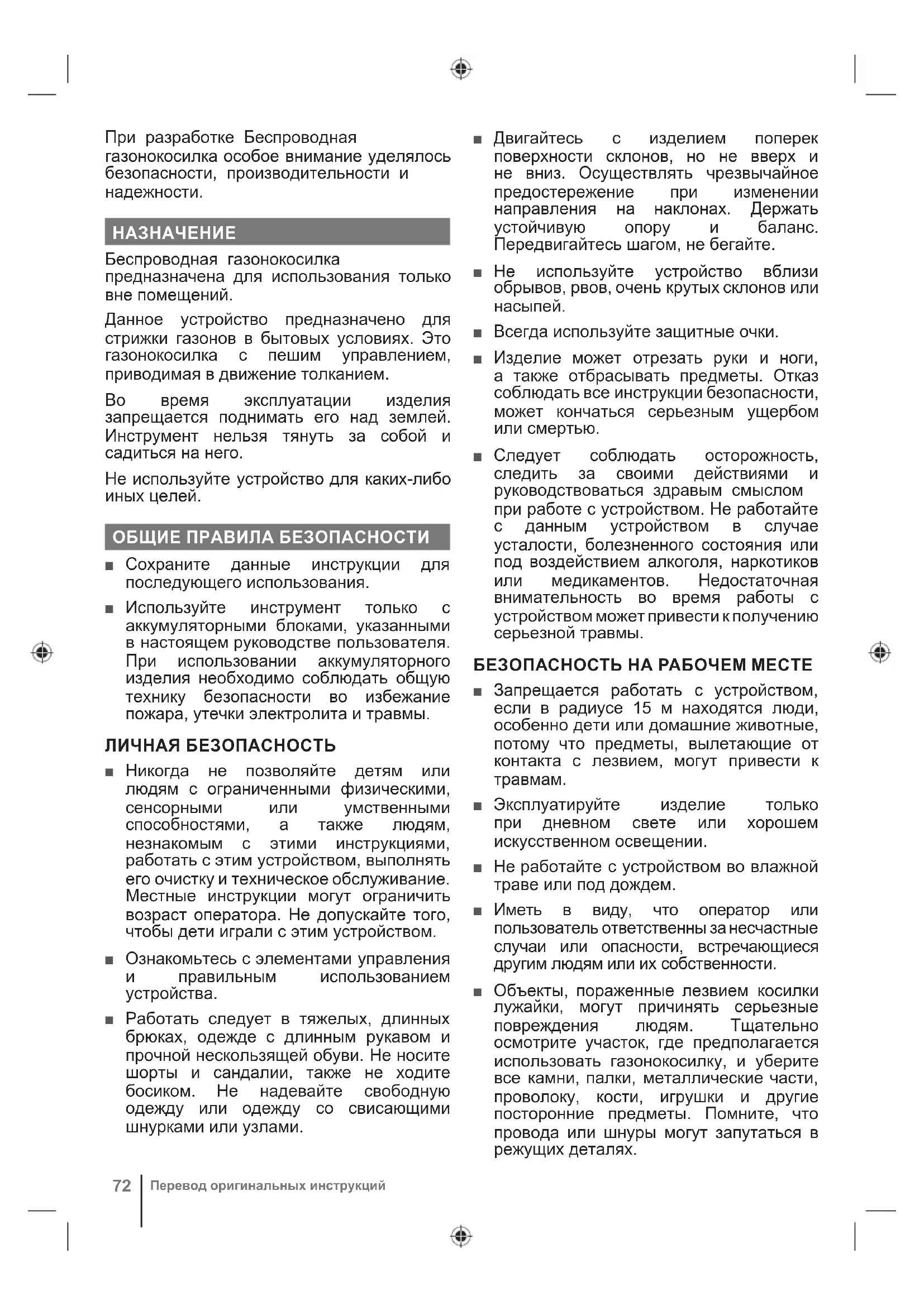 ■ Не сжигайте аккумуляторную батарею. ■ При ненормальных условиях из батареи может вытечь жидкость, избегайте контакта с ней. Если этого избежать не удалось, смойте жидкость водой. Если жидкость74 Перевод оригинальных инструкций попала в глаза, после их промывания обратитесь за медицинской помощью. Жидкость, вытекшая из батареи, может вызвать раздражение или ожог. ПРЕДОСТЕРЕЖЕНИЯ ОТНОСИТЕЛЬНО БЕЗОПАСНОГО ПОЛЬЗОВАНИЯ ГАЗОНОКОСИЛКИ