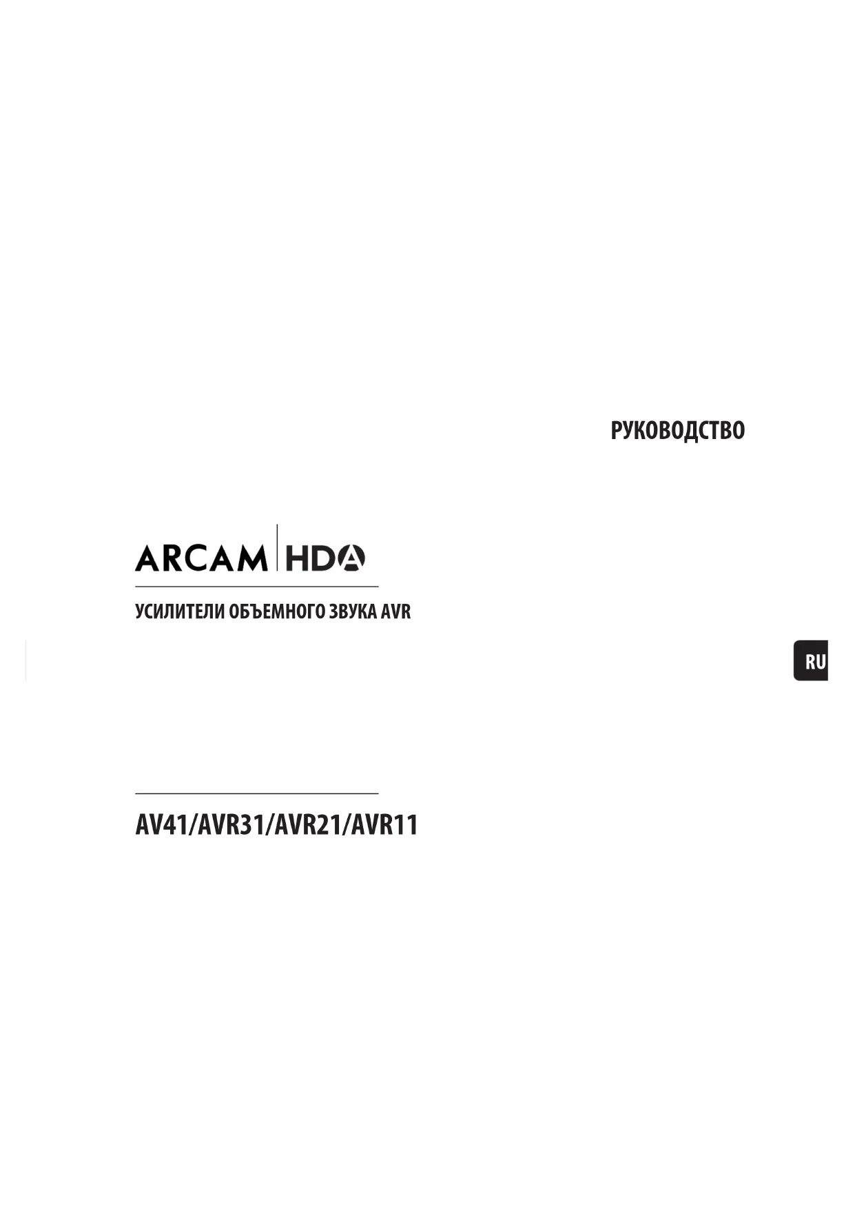 Работа Тюнера RU-37 Устранение неисправностей RU-38 Технические характеристики RU-40 Международная гарантия RU-42 Вам необходима профессиональная установка? Вполне возможно, что ваш ресивер был установлен и настроен как часть вашего оборудования Hi-Fi квалифицированным дилером компании Arcam. В этом случае вы можете пропустить разделы данного руководства, связанные с установкой и настройкой, и перейти непосредственно к разделам, которые касаются использования ресивера. Используйте содержание, чтобы перейти к этим разделам. Вы хотите установить ресивер самостоятельно? Ресивер – это мощная и сложная часть AV-оборудования. Если вы устанавливаете ресивер самостоятельно, мы рекомендуем вам до начала установки внимательно прочитать это руководство по эксплуатации. Например, правильная конфигурация динамиков и их размещение помогут раскрыть все преимущества вашего ресивера. Также убедитесь, что все элементы системы работают согласованно.RU-4 Перед началом работы… Ресивер Arcam HDA В ресиверах установлены процессоры домашних кинотеатров высокого качества и высокой производительности, а усилители спроектированы в соответствии с уровнем качества и стандартами производства компании Arcam. Они сочетают в себе цифровую обработку с высокими характеристиками аудио- и видеокомпонентов, чтобы создать для вас непревзойденный домашний развлекательный центр. Помимо внутренних FM-радиоприемников и радиоприемников цифрового вещания, ресиверы обеспечивают переключение и управление семью аналоговыми и шестью цифровыми источниками аудиосигнала, а также сетевыми источниками аудиосигнала, что делает эти модели идеальными концентраторами для домашних кинотеатров и двухканальных стереосистем. Поскольку многие из этих источников способны также генерировать видеосигналы, ресиверы обеспечивают высококачественное переключение видео- и аудосигнала HDMI (7 каналов HDMI2.1 @ 40Gbit/s, HDCP 2.3). Управление ресивером осуществляется с помощью кнопок управления на передней панели, ИК-пульта дистанционного управления, IP-контроллера (Ethernet) или порта RS232. Пульт ДУ, поставляемый с ресивером, представляет собой универсальный обучаемый пульт дистанционного управления различными устройствами, который прост в использовании и после настройки способен управлять всей системой. Его также можно запрограммировать с использованием его собственных обширных внутренних библиотек кодов для управления CD-плеерами и BD-плеерами, персональными видеоплеерами с функцией записи, телевизорами и другими устройствами. Установка ресивера в помещении для прослушивания является важным процессом, который требует внимания на каждом этапе. По этой причине информация об установке носит всеобъемлющий характер и ее необходимо тщательно изучать, чтобы достичь непревзойденных характеристик устройства. Ресивер предназначен для воспроизведения по- настоящему реалистичного звука в любых сценариях использования, будь то прослушивание музыки или просмотр кинофильмов. HOME THEATRE POWER
