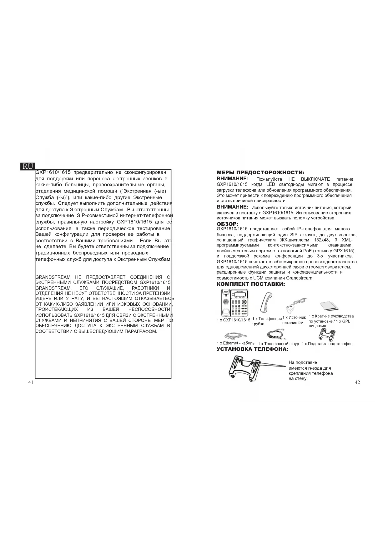 GXP1610/1615 предварительно не сконфигурирован для поддержки или переноса экстренных звонков в какие-либо больницы, правоохранительные органы, отделения медицинской помощи (“Экстренная (-ые) Служба (-ы)”), или какие-либо другие Экстренные службы. Следует выполнить дополнительные действия для доступа к Экстренным Службам. Вы ответственны за подключение SIP-совместимой интернет-телефонной службы, правильную настройку GXP1610/1615 для ее использования, а также периодическое тестирование Вашей конфигурации для проверки ее работы в соответствии с Вашими требованиями. Если Вы это не сделаете, Вы будете ответственны за подключение традиционных беспроводных или проводных телефонных служб для доступа к Экстренным Службам. GRANDSTREAM НЕ ПРЕДОСТАВЛЯЕТ СОЕДИНЕНИЯ С ЭКСТРЕННЫМИ СЛУЖБАМИ ПОСРЕДСТВОМ GXP1610/1615. GRANDSTREAM, ЕГО СЛУЖАЩИЕ, РАБОТНИКИ И ОТДЕЛЕНИЯ НЕ НЕСУТ ОТВЕТСТВЕННОСТИ ЗА ПРЕТЕНЗИИ, УЩЕРБ ИЛИ УТРАТУ, И ВЫ НАСТОЯЩИМ ОТКАЗЫВАЕТЕСЬ ОТ КАКИХ-ЛИБО ЗАЯВЛЕНИЙ ИЛИ ИСКОВЫХ ОСНОВАНИЙ, ПРОИСТЕКАЮЩИХ ИЗ ВАШЕЙ НЕСПОСОБНОСТИ ИСПОЛЬЗОВАТЬ GXP1610/1615 ДЛЯ СВЯЗИ С ЭКСТРЕННЫМИ СЛУЖБАМИ И НЕПРИНЯТИЯ С ВАШЕЙ СТОРОНЫ МЕР ПО ОБЕСПЕЧЕНИЮ ДОСТУПА К ЭКСТРЕННЫМ СЛУЖБАМ В СООТВЕТСТВИИ С ВЫШЕСЛЕДУЮЩИМ ПАРАГРАФОМ. GXP1610/1615 представляет собой IP-телефон для малого бизнеса, поддерживающий один SIP аккаунт, до двух звонков, оснащенный графическим ЖК-дисплеем 132x48, 3 XML- программируемыми контекстно-зависимыми клавишами, двойным сетевым портом с технологией PoE (только у GPX1615), и поддержкой режима конференции до 3-х участников. GXP1610/1615 сочетает в себе микрофон превосходного качества для одновременной двухсторонней связи с громкоговорителем, расширенные функции защиты и конфиденциальности и совместимость с UCM компании Grandstream.