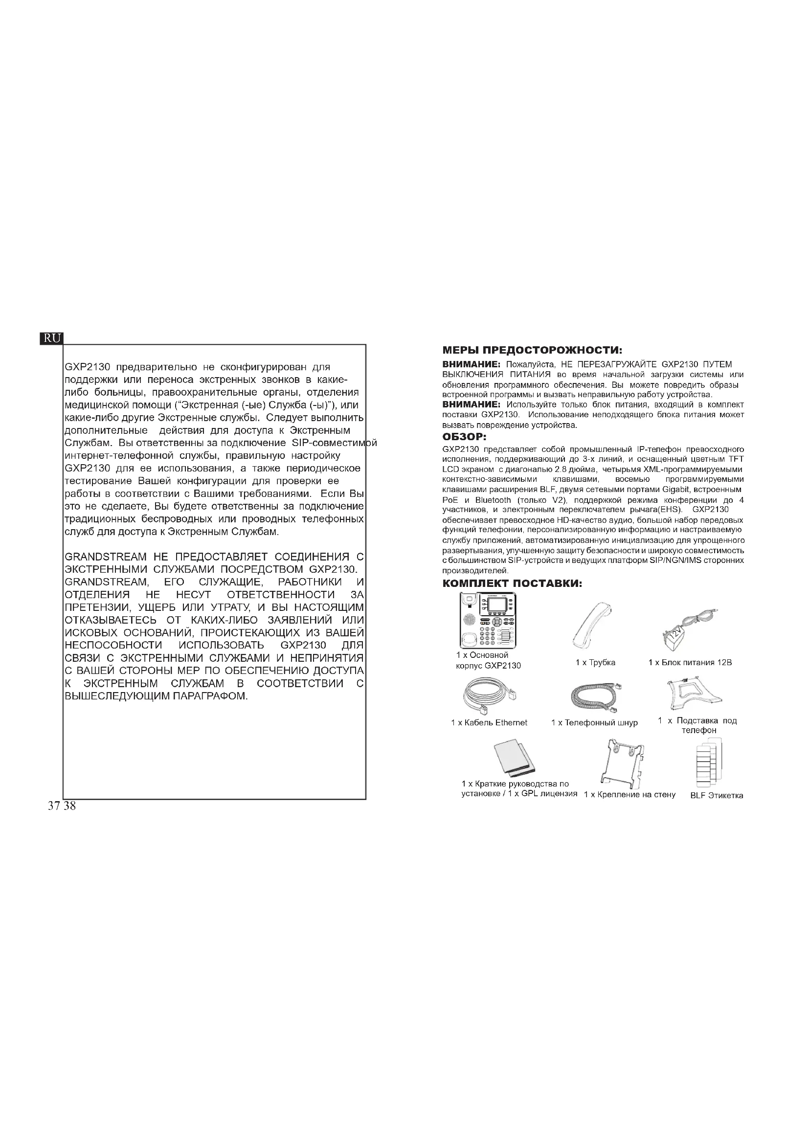 numerico, è possibile inoltre configurare il telefono usando o un IP statico o un DHCP.37 38 GXP2130 предварительно не сконфигурирован для поддержки или переноса экстренных звонков в какие- либо больницы, правоохранительные органы, отделения медицинской помощи (“Экстренная (-ые) Служба (-ы)”), или какие-либо другие Экстренные службы. Следует выполнить дополнительные действия для доступа к Экстренным Службам. Вы ответственны за подключение SIP-совместимой интернет-телефонной службы, правильную настройку GXP2130 для ее использования, а также периодическое тестирование Вашей конфигурации для проверки ее работы в соответствии с Вашими требованиями. Если Вы это не сделаете, Вы будете ответственны за подключение традиционных беспроводных или проводных телефонных служб для доступа к Экстренным Службам. GRANDSTREAM НЕ ПРЕДОСТАВЛЯЕТ СОЕДИНЕНИЯ С ЭКСТРЕННЫМИ СЛУЖБАМИ ПОСРЕДСТВОМ GXP2130. GRANDSTREAM, ЕГО СЛУЖАЩИЕ, РАБОТНИКИ И ОТДЕЛЕНИЯ НЕ НЕСУТ ОТВЕТСТВЕННОСТИ ЗА ПРЕТЕНЗИИ, УЩЕРБ ИЛИ УТРАТУ, И ВЫ НАСТОЯЩИМ ОТКАЗЫВАЕТЕСЬ ОТ КАКИХ-ЛИБО ЗАЯВЛЕНИЙ ИЛИ ИСКОВЫХ ОСНОВАНИЙ, ПРОИСТЕКАЮЩИХ ИЗ ВАШЕЙ НЕСПОСОБНОСТИ ИСПОЛЬЗОВАТЬ GXP2130 ДЛЯ СВЯЗИ С ЭКСТРЕННЫМИ СЛУЖБАМИ И НЕПРИНЯТИЯ С ВАШЕЙ СТОРОНЫ МЕР ПО ОБЕСПЕЧЕНИЮ ДОСТУПА К ЭКСТРЕННЫМ СЛУЖБАМ В СООТВЕТСТВИИ С ВЫШЕСЛЕДУЮЩИМ ПАРАГРАФОМ. КОМПЛЕКТ ПОСТАВКИ: