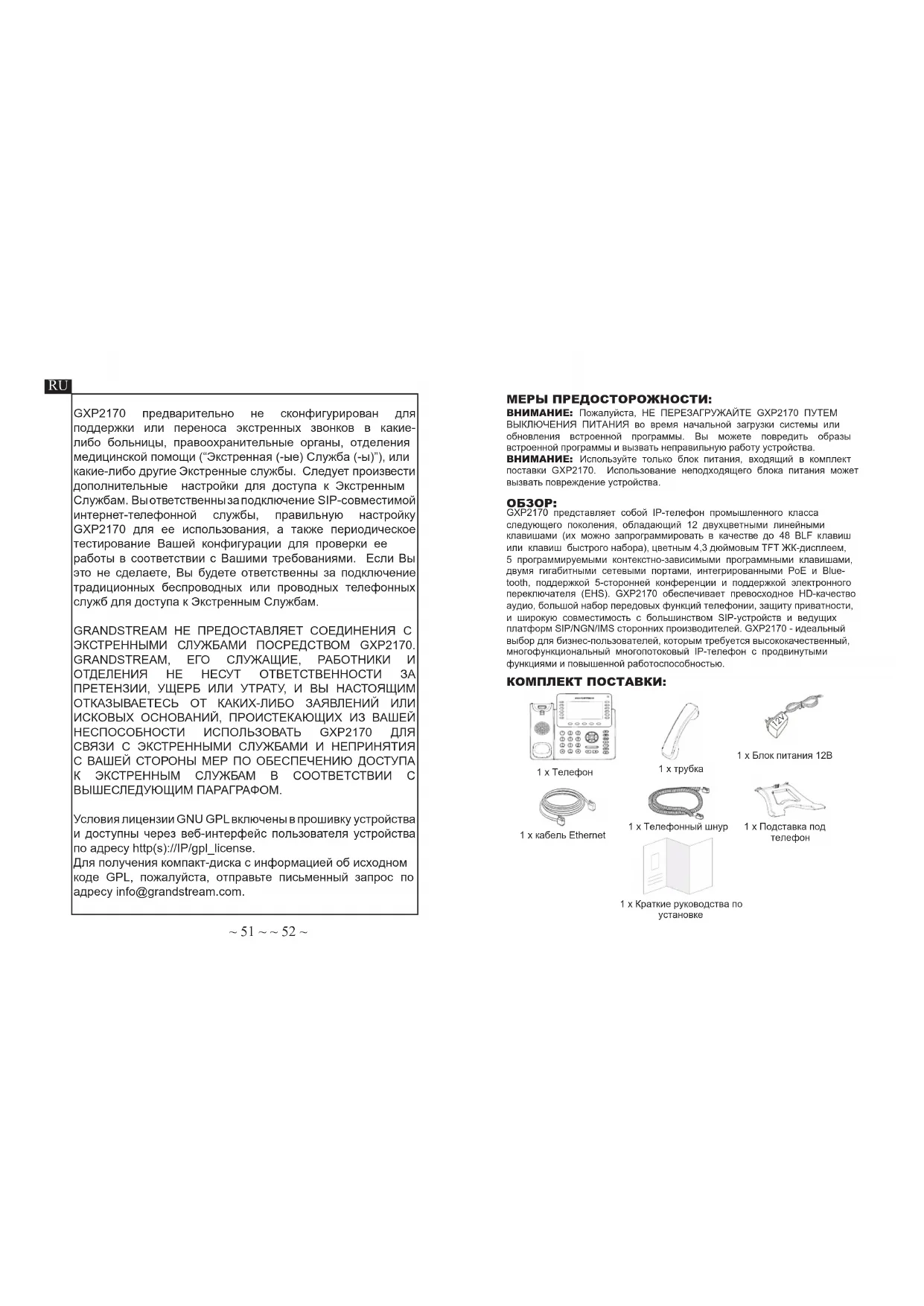 1 x Блок питания 12В МЕРЫ ПРЕДОСТОРОЖНОСТИ: 12V GXP2170 предварительно не сконфигурирован для поддержки или переноса экстренных звонков в какие- либо больницы, правоохранительные органы, отделения медицинской помощи (“Экстренная (-ые) Служба (-ы)”), или какие-либо другие Экстренные службы. Следует произвести дополнительные настройки для доступа к Экстренным Службам. Вы ответственны за подключение SIP-совместимой интернет-телефонной службы, правильную настройку GXP2170 для ее использования, а также периодическое тестирование Вашей конфигурации для проверки ее работы в соответствии с Вашими требованиями. Если Вы это не сделаете, Вы будете ответственны за подключение традиционных беспроводных или проводных телефонных служб для доступа к Экстренным Службам. GRANDSTREAM НЕ ПРЕДОСТАВЛЯЕТ СОЕДИНЕНИЯ С ЭКСТРЕННЫМИ СЛУЖБАМИ ПОСРЕДСТВОМ GXP2170. GRANDSTREAM, ЕГО СЛУЖАЩИЕ, РАБОТНИКИ И ОТДЕЛЕНИЯ НЕ НЕСУТ ОТВЕТСТВЕННОСТИ ЗА ПРЕТЕНЗИИ, УЩЕРБ ИЛИ УТРАТУ, И ВЫ НАСТОЯЩИМ ОТКАЗЫВАЕТЕСЬ ОТ КАКИХ-ЛИБО ЗАЯВЛЕНИЙ ИЛИ ИСКОВЫХ ОСНОВАНИЙ, ПРОИСТЕКАЮЩИХ ИЗ ВАШЕЙ НЕСПОСОБНОСТИ ИСПОЛЬЗОВАТЬ GXP2170 ДЛЯ СВЯЗИ С ЭКСТРЕННЫМИ СЛУЖБАМИ И НЕПРИНЯТИЯ С ВАШЕЙ СТОРОНЫ МЕР ПО ОБЕСПЕЧЕНИЮ ДОСТУПА К ЭКСТРЕННЫМ СЛУЖБАМ В СООТВЕТСТВИИ С ВЫШЕСЛЕДУЮЩИМ ПАРАГРАФОМ. Условия лицензии GNU GPL включены в прошивку устройства и доступны через веб-интерфейс пользователя устройства по адресу http(s)://IP/gpl_license. Для получения компакт-диска с информацией об исходном коде GPL, пожалуйста, отправьте письменный запрос по адресу info@grandstream.com.