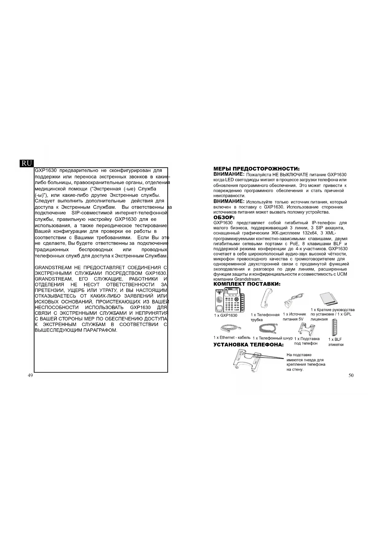 GXP1630 предварительно не сконфигурирован для поддержки или переноса экстренных звонков в какие- либо больницы, правоохранительные органы, отделения медицинской помощи (“Экстренная (-ые) Служба (-ы)”), или какие-либо другие Экстренные службы. Следует выполнить дополнительные действия для доступа к Экстренным Службам. Вы ответственны за подключение SIP-совместимой интернет-телефонной службы, правильную настройку GXP1630 для ее использования, а также периодическое тестирование Вашей конфигурации для проверки ее работы в соответствии с Вашими требованиями. Если Вы это не сделаете, Вы будете ответственны за подключение традиционных беспроводных или проводных телефонных служб для доступа к Экстренным Службам. GRANDSTREAM НЕ ПРЕДОСТАВЛЯЕТ СОЕДИНЕНИЯ С ЭКСТРЕННЫМИ СЛУЖБАМИ ПОСРЕДСТВОМ GXP1630. GRANDSTREAM, ЕГО СЛУЖАЩИЕ, РАБОТНИКИ И ОТДЕЛЕНИЯ НЕ НЕСУТ ОТВЕТСТВЕННОСТИ ЗА ПРЕТЕНЗИИ, УЩЕРБ ИЛИ УТРАТУ, И ВЫ НАСТОЯЩИМ ОТКАЗЫВАЕТЕСЬ ОТ КАКИХ-ЛИБО ЗАЯВЛЕНИЙ ИЛИ ИСКОВЫХ ОСНОВАНИЙ, ПРОИСТЕКАЮЩИХ ИЗ ВАШЕЙ НЕСПОСОБНОСТИ ИСПОЛЬЗОВАТЬ GXP1630 ДЛЯ СВЯЗИ С ЭКСТРЕННЫМИ СЛУЖБАМИ И НЕПРИНЯТИЯ С ВАШЕЙ СТОРОНЫ МЕР ПО ОБЕСПЕЧЕНИЮ ДОСТУПА К ЭКСТРЕННЫМ СЛУЖБАМ В СООТВЕТСТВИИ С ВЫШЕСЛЕДУЮЩИМ ПАРАГРАФОМ.